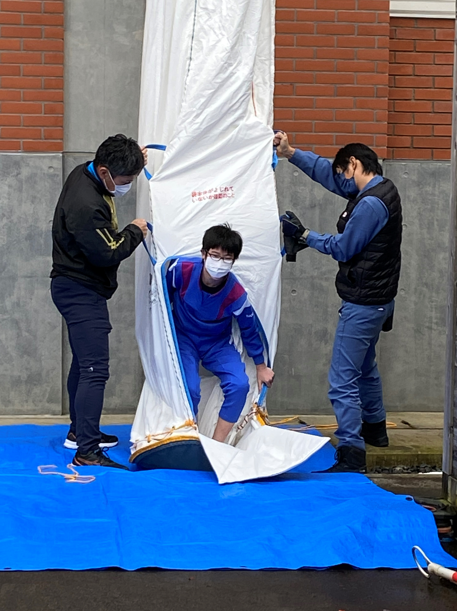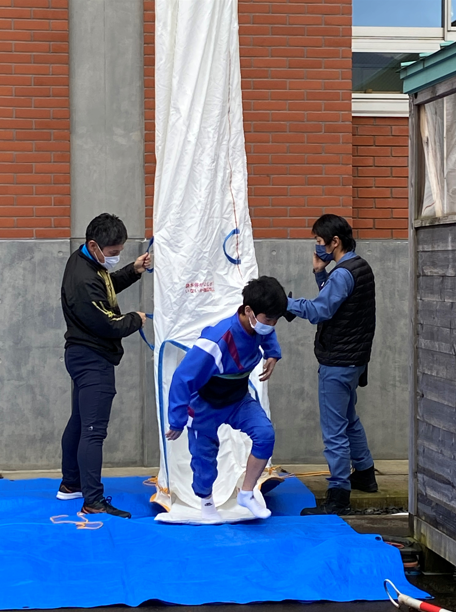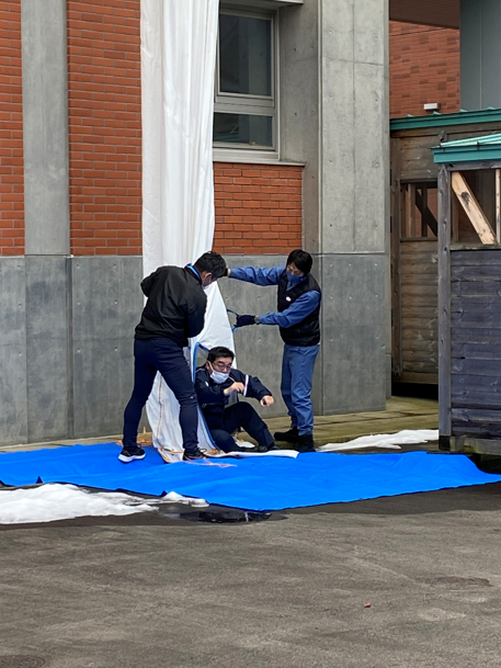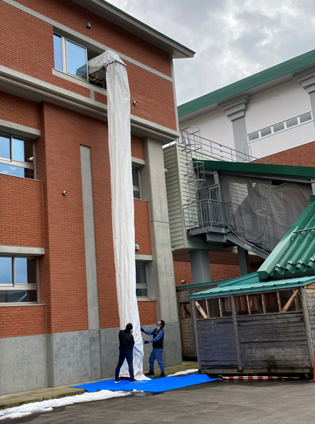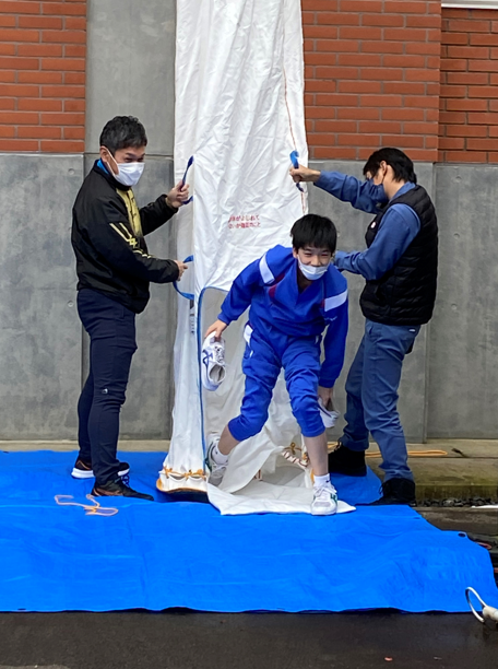 そして、今回は3階廊下に設置してある避難救助袋を使っての避難体験も行いました。教職員と生徒の代表が3階から避難救助袋の中を通って屋外に脱出しました。なお、避難救助袋の設置業者の方にも来ていただき、安全に十分配慮して行いました。