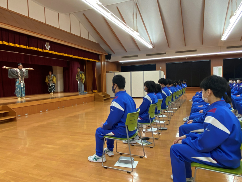 実際に目の前で狂言を鑑賞したり、体験したりすることを通して、日本の伝統芸能である能楽(能・狂言)について楽しく学ぶことができ、生徒たちだけでなく教職員にとっても大変貴重な機会となりました。