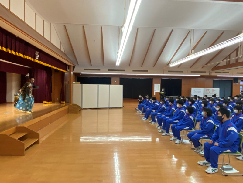 12/2(木)に芸術鑑賞教室を実施しました。今回は、文化庁主催の「子供のための文化芸術鑑賞・体験支援事業」の一環として、狂言鑑賞と狂言体験プログラムを実施しました。当日は狂言方大蔵流の4名の方が演じてくださった狂言「棒縛」を全校生で鑑賞しました。舞台上で繰り広げられる狂言の世界に生徒たちはすっかり入り込み、食い入るように見つめていました。ときおり笑い声も聞こえるなど狂言の世界を十分楽しむことができました。生徒たちの鑑賞態度や反応のよさに、狂言方大蔵流、能楽協会の方々も感心されていました