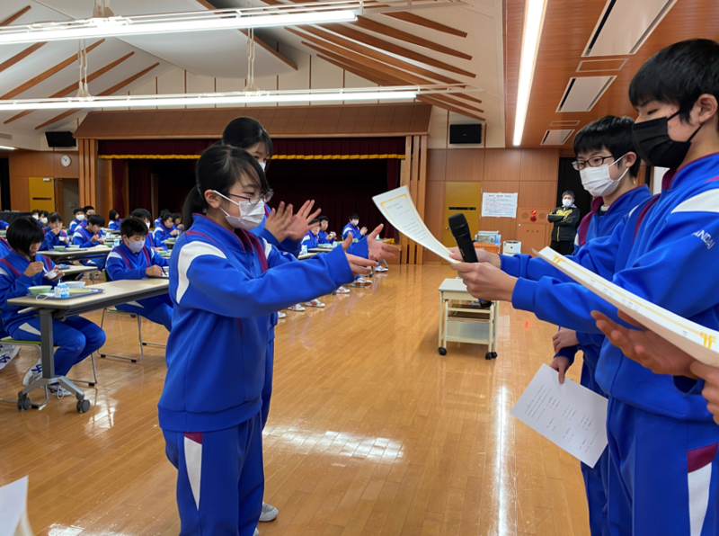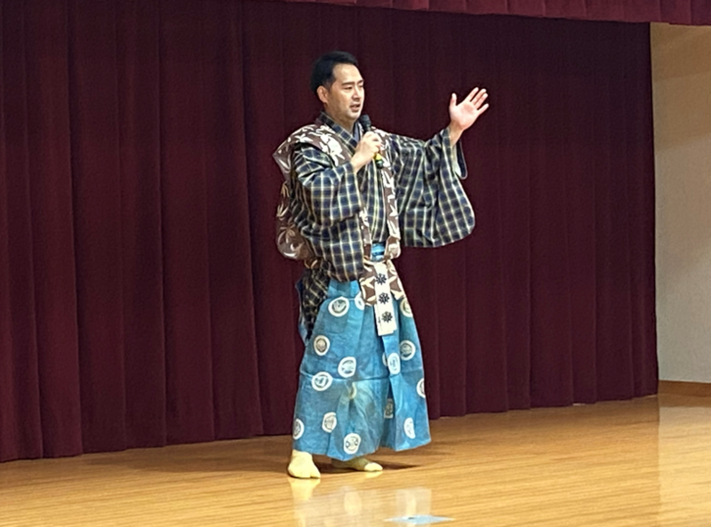 上演後は狂言を演じるときの笑い方や泣き方を教えていただき、生徒たちも狂言風に笑ったり、泣いたりしたほかにも一緒に歌を歌ったりしました。また、質疑応答では「柿を食べる場面を演じてください!」という生徒からのリクエストにも応えていただきました。それぞれの流派で柿の食べ方の表現も異なるということで、テレビでよく見るお笑い芸人の「あむ、あむ、あむ」というものまねとは違っていました
