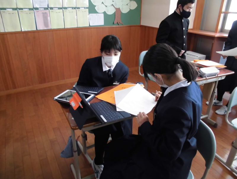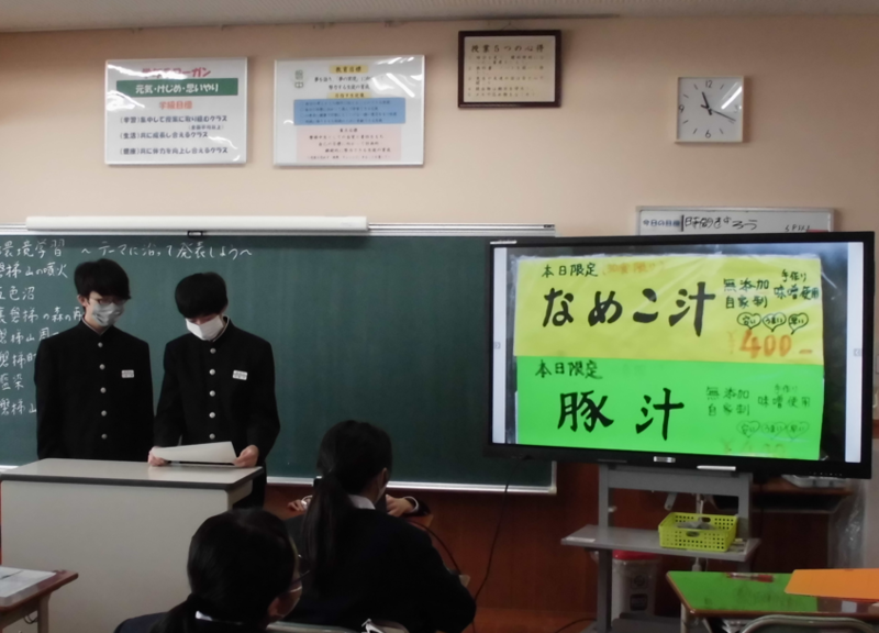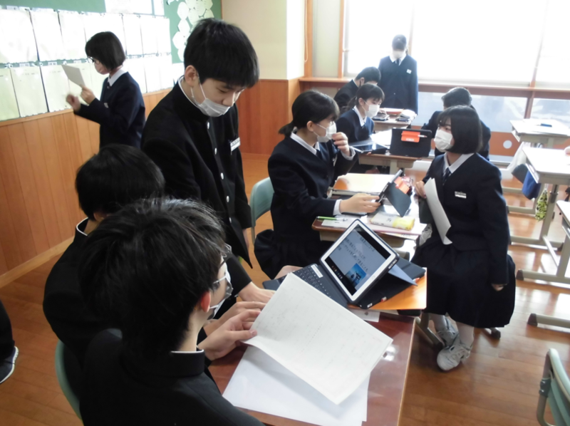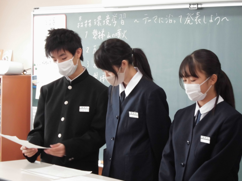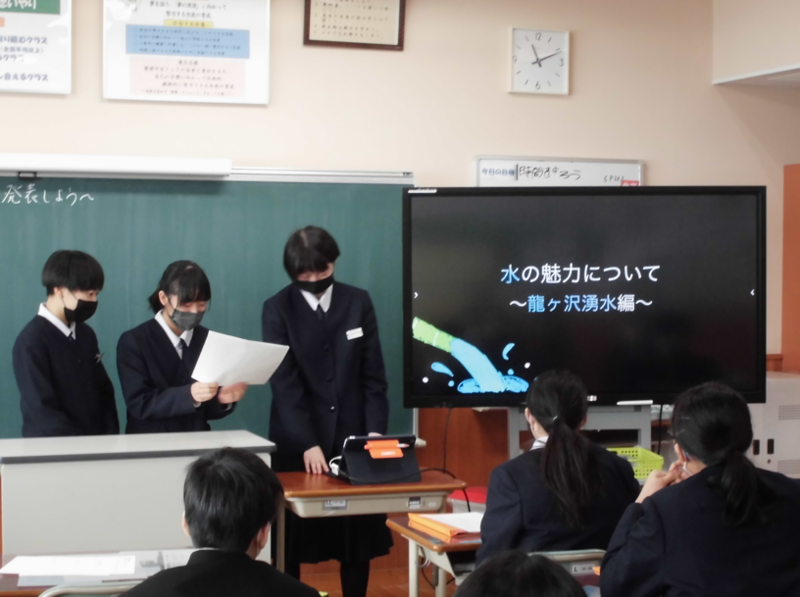 12/3(金)に、1年生が9月に実施した森林環境学習の発表会を行いました。磐梯山の噴火や噴火後の裏磐梯の森林再生、磐梯町の水と猫魔ヶ岳、藍染めなどのテーマに沿って、各グループごとにタブレットを使ってまとめたものを発表しました。自分たちの身近にある磐梯山やその周辺の環境や産業について、その魅力をあらためて感じることができたようです。