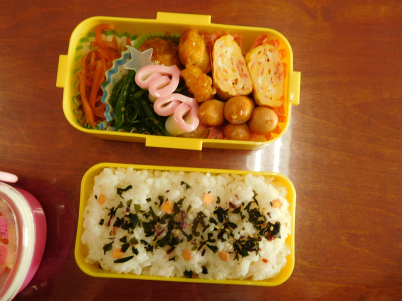 1年生も一生懸命作りました。彩りのバランスもいいですし、おかずなどをハート型や花の模様に盛り付けるなどキレイに見える工夫も施されているお弁当もありますね みんなおいしそうに笑顔で食べていました