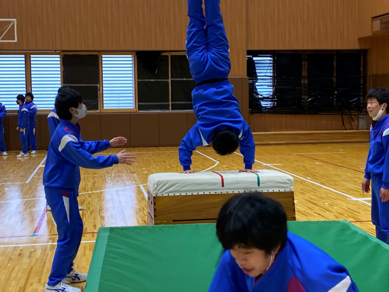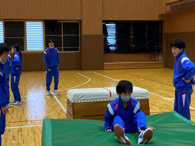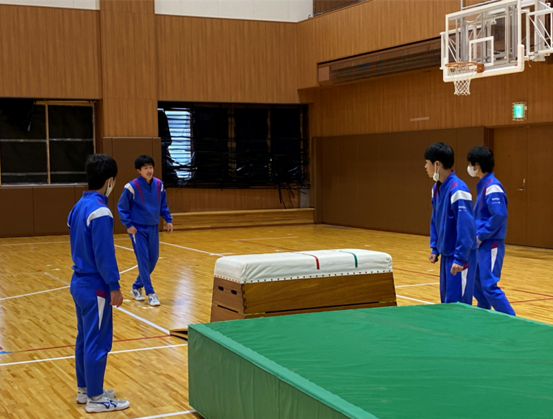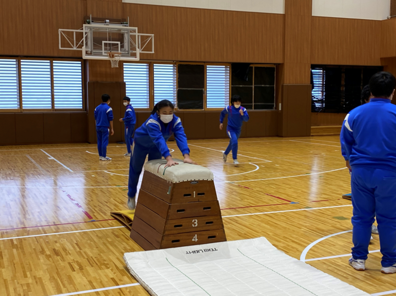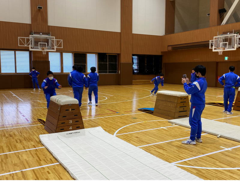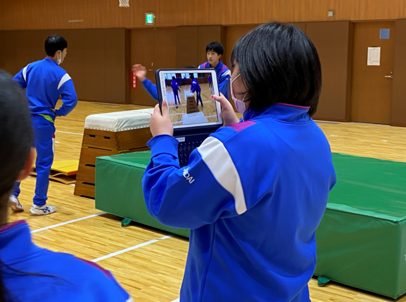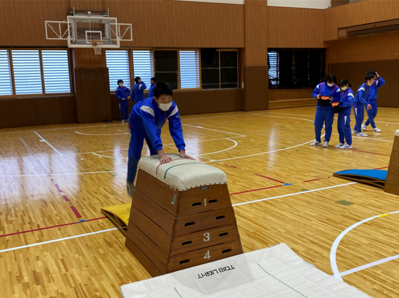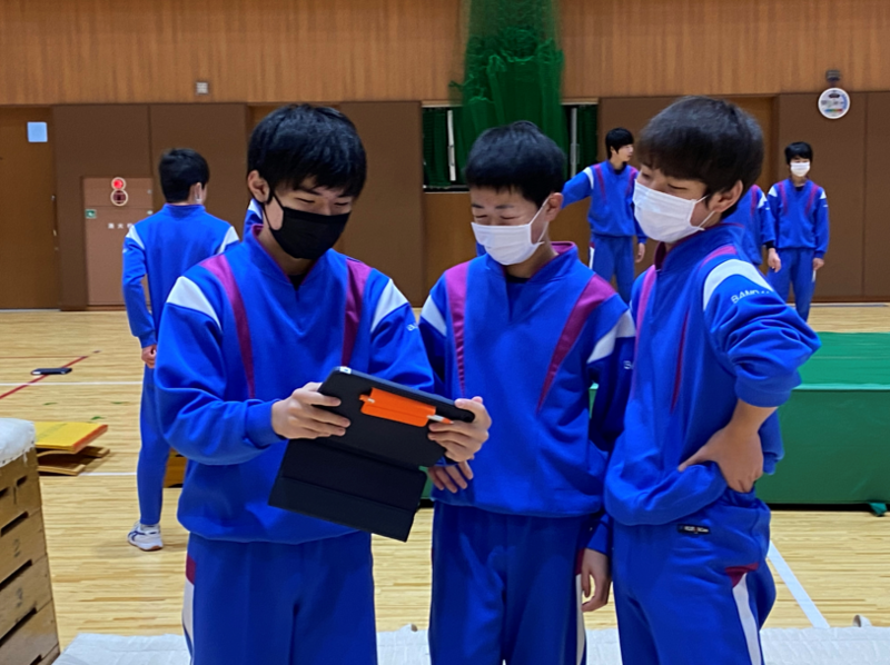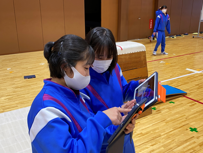 2年生の保健体育の授業では跳び箱に取り組んでいます。跳ぶ様子をタブレットで動画撮影したものを見ながら、自分の跳び方の改善点などを確認しています。タブレットを有効に活用して技術の向上を目指していました。