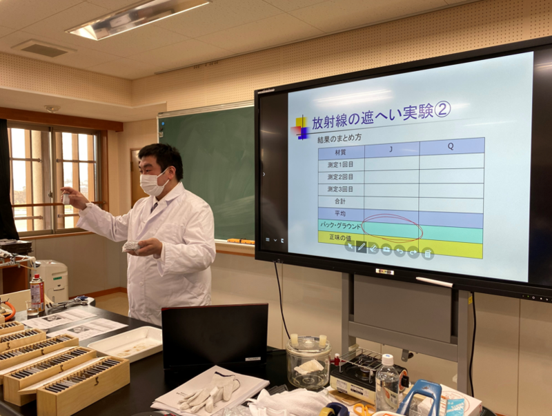 今日は全学年で放射線教育を実施します。1年生は放射線の遮へい実験を行いました。アルミ板と鉛板では遮へいされる放射線の量に差があるのかを測定しました。