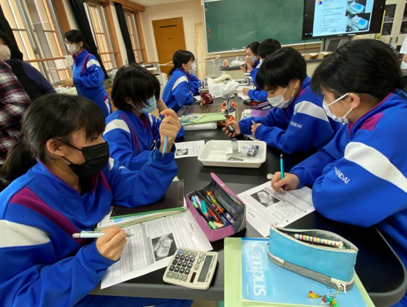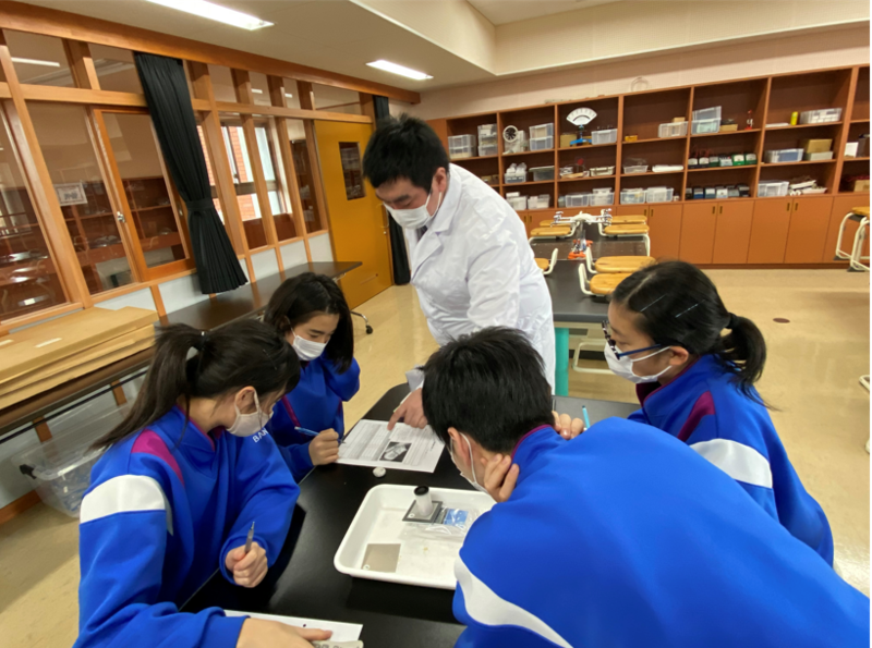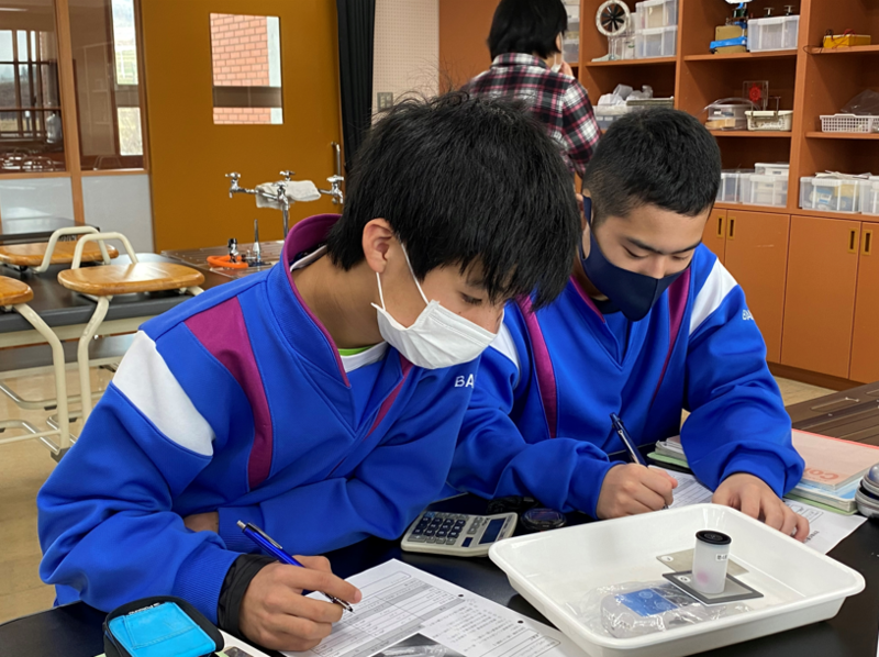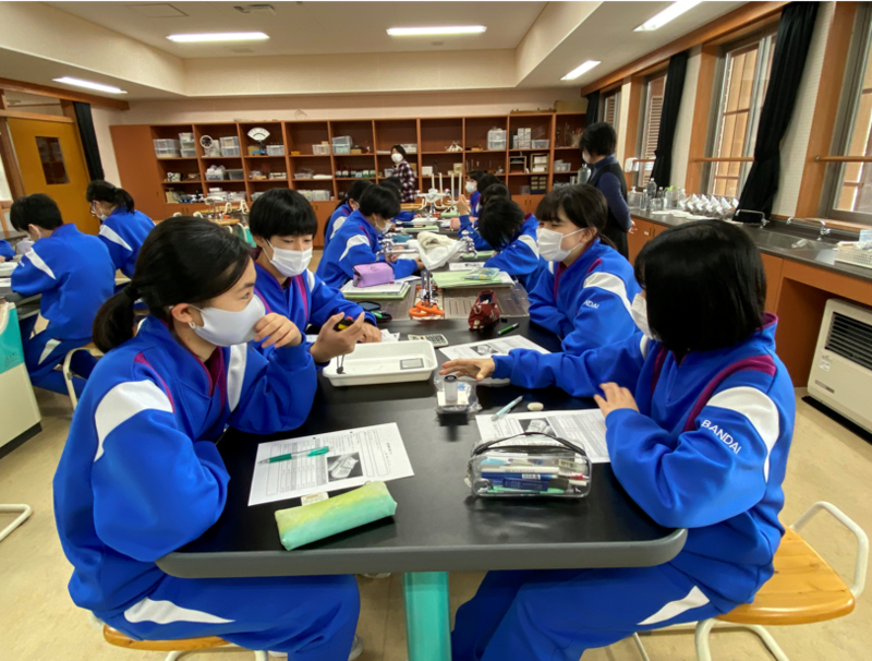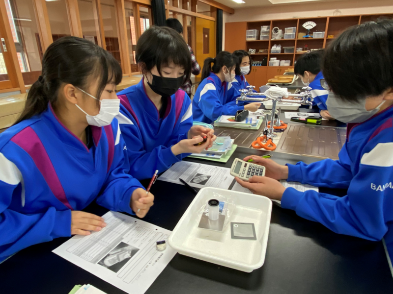 2021年12月9日 11時35分今日は全学年で放射線教育を実施します。1年生は放射線の遮へい実験を行いました。アルミ板と鉛板では遮へいされる放射線の量に差があるのかを測定しました。