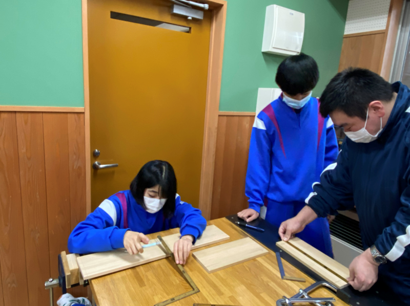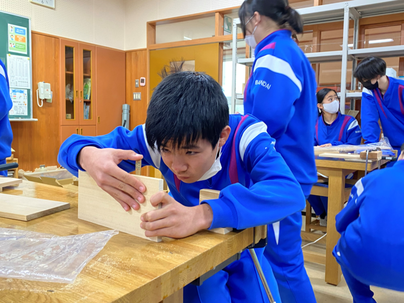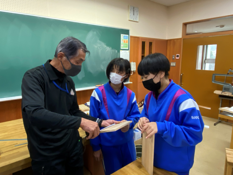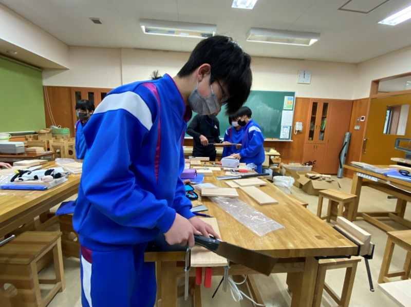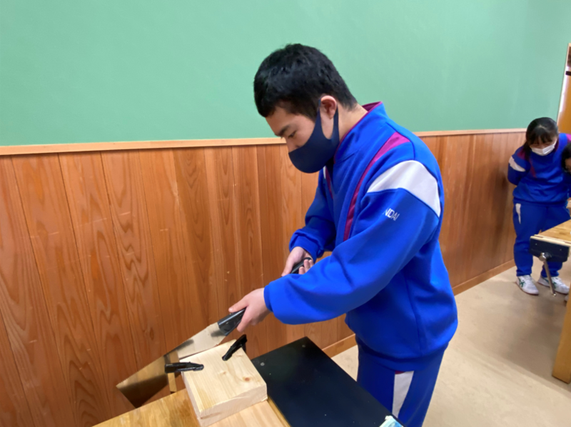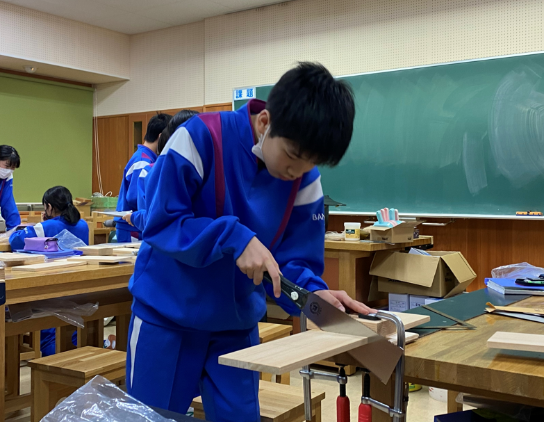 1年生の技術の授業ではCDラック製作に取り組んでいます。本日も特別非常勤講師の田部先生にご指導をいただきました。のこぎりの使い方も上達しているようです