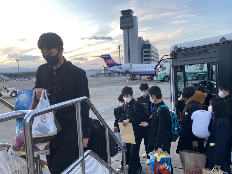 先ほど福島空港を出発しました。学校到着は予定通り19:40頃の予定です。みんな元気です 保護者の皆様、お迎えをお願いします