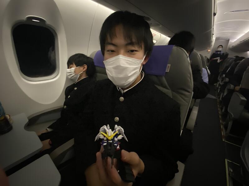 Hくんは、機内でガンダムのガチャガチャを組み立てて楽しんでいました