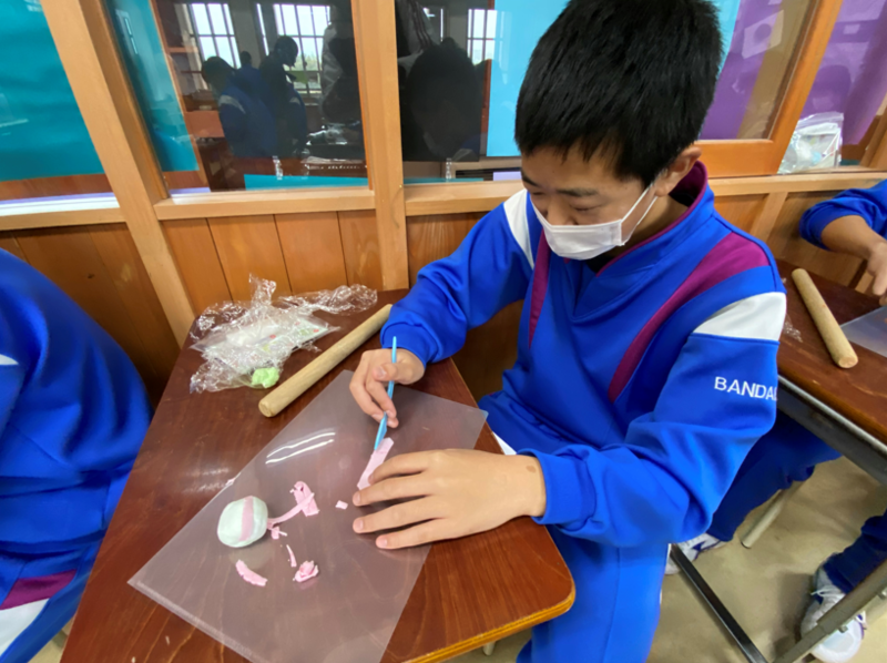 2年生の美術の授業では、紙粘土を使った和菓子作りに取り組んでいます。紙粘土に着色したり、こねたり、形取ったり… 和菓子職人への道を突き進む2年生です