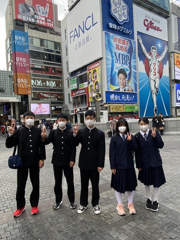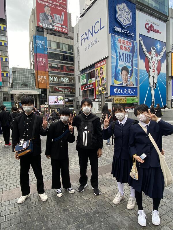 グリコの看板で有名な戎橋に来ました。ここで一度解散して、12:45まで班ごとの自由行動になります。ちなみに、迷子になったら「グリコの看板の橋はどこですか?」と聞くといいとのこと。それなら安心ですね
