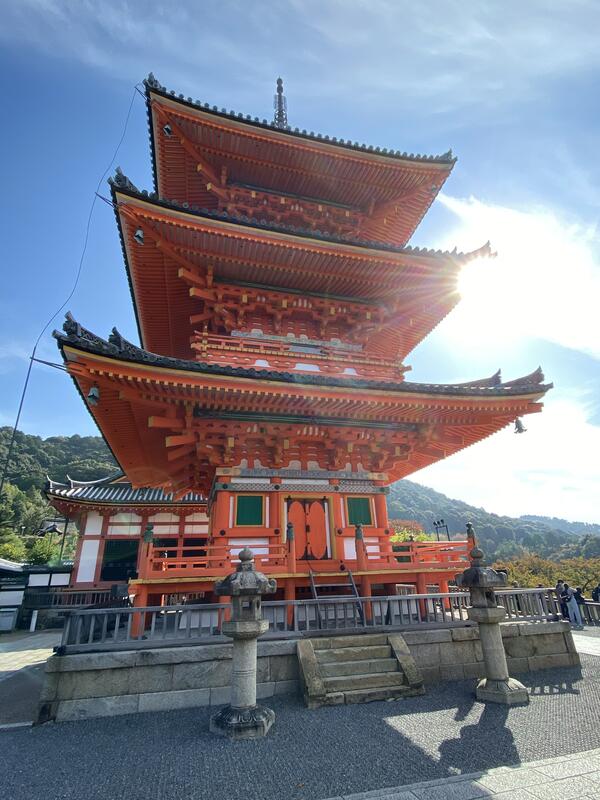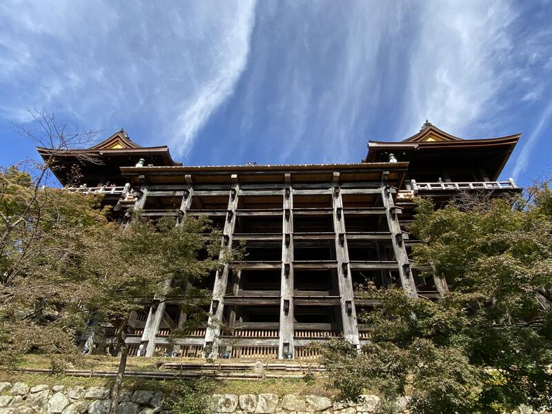 清水寺といえば、やはり清水の舞台ですね。清水の舞台からの眺望はもちろんステキですが、下から見上げる清水の舞台は圧巻ですね。