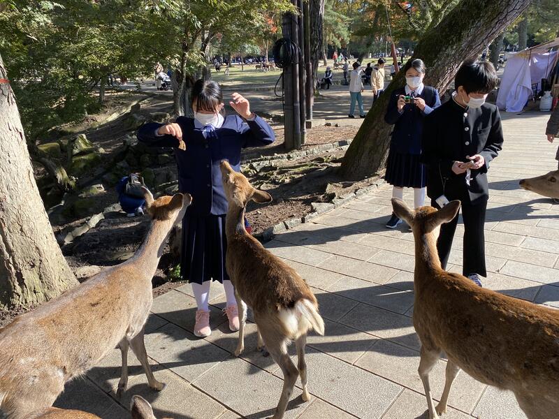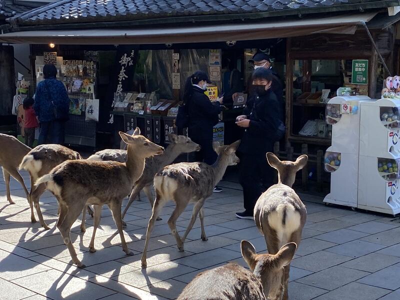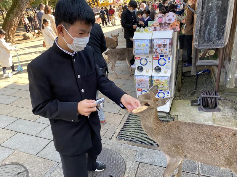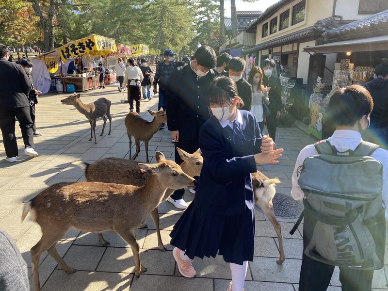 東大寺に着きました。まずは定番の鹿のエサやりです。鹿に囲まれてあたふたしてます。