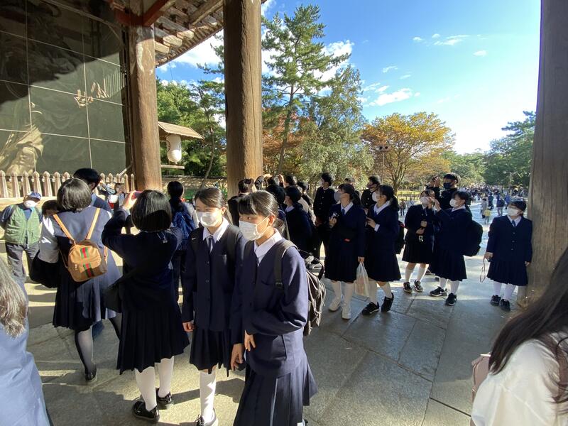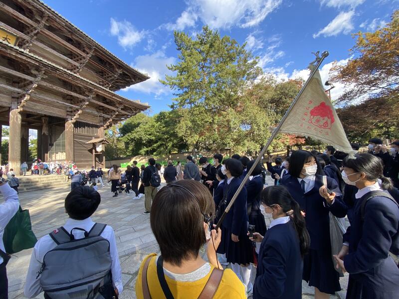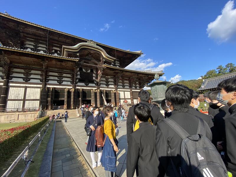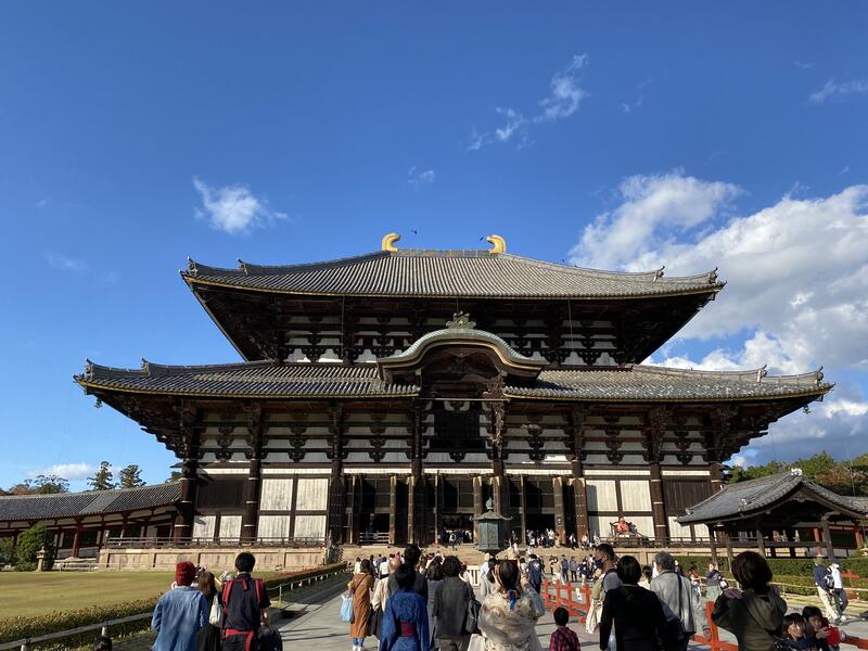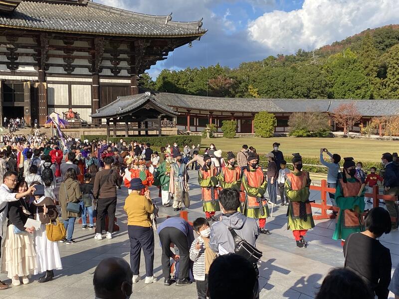 2021年11月3日 16時20分いよいよ大仏殿です。タイミングよく、天平行列が行われていました。色とりどりの鮮やかな衣装と厳かな雰囲気に見とれていました。