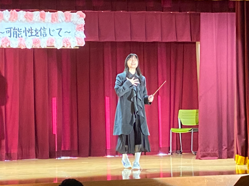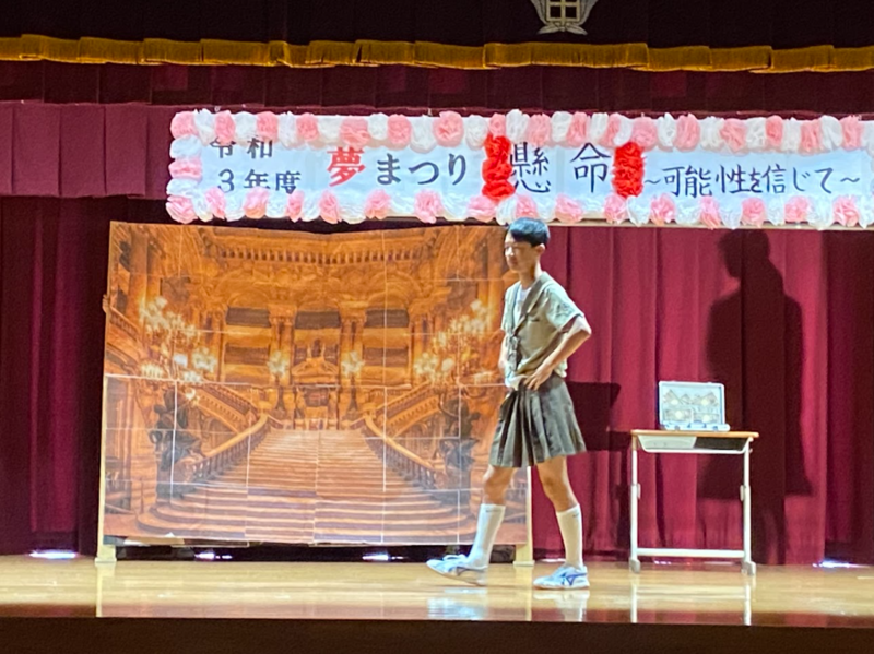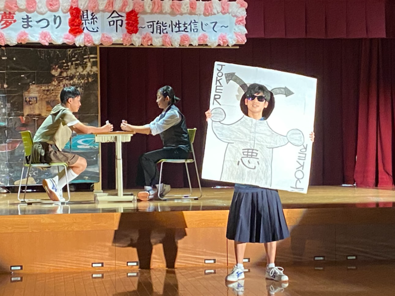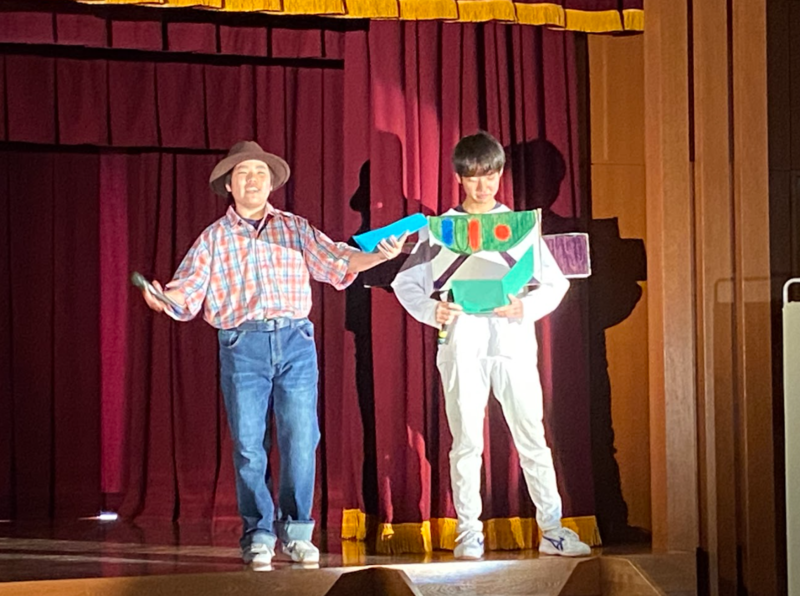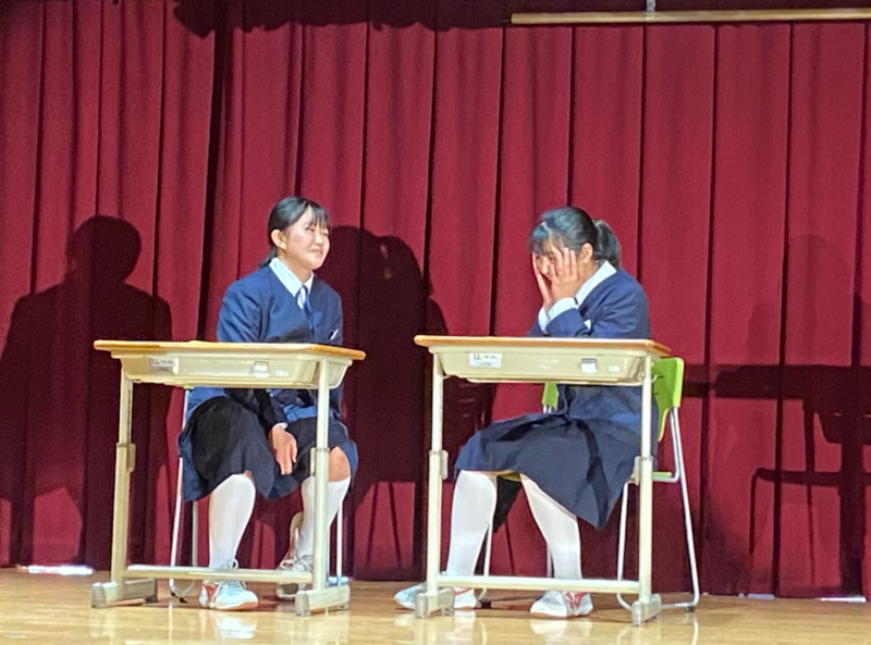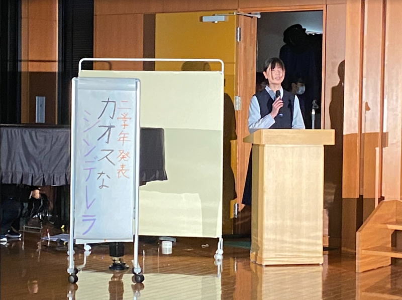 2年生の学年発表は劇「カオスなシンデレラ」です。ダンスあり,オタ芸あり,クイズありの盛りだくさんな内容とユニークなストーリーに,観衆はカオスな世界に引き込まれていました。担任のF先生の初めてのデートは水族館だったとは…