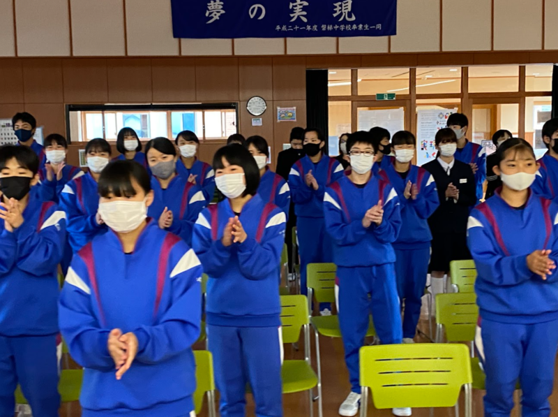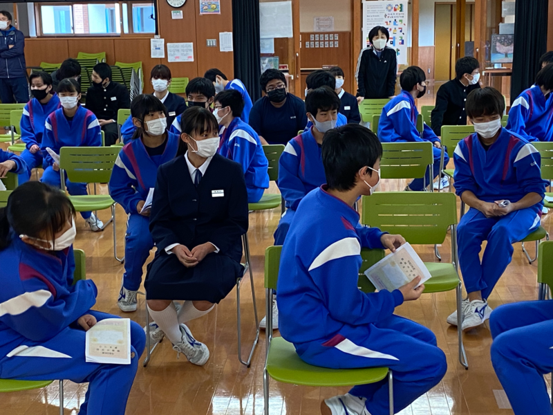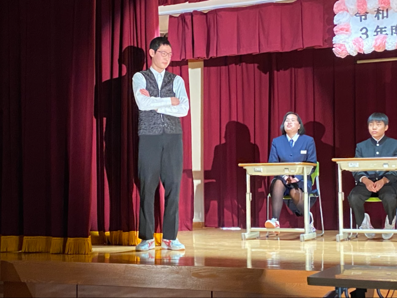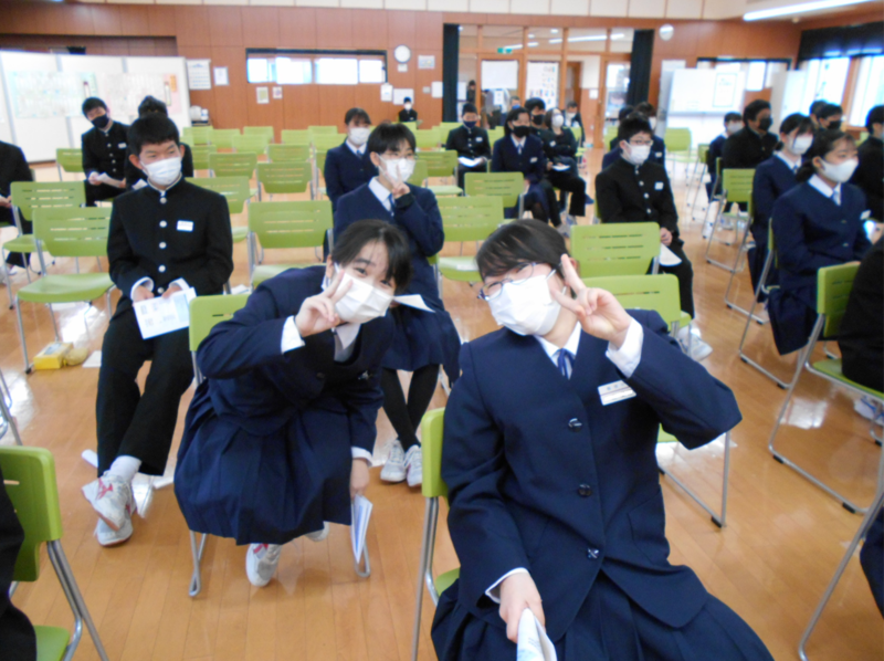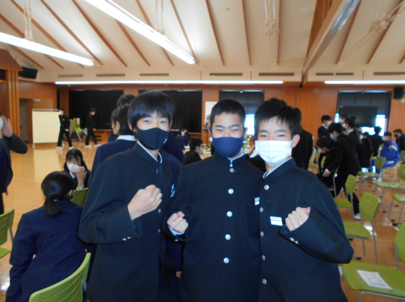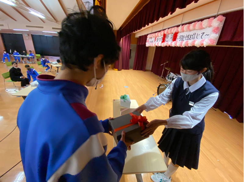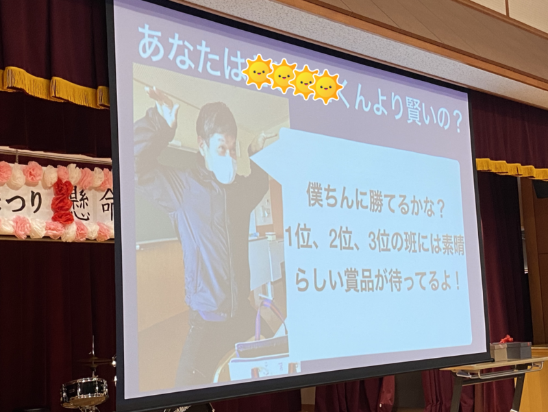 今年の生徒会企画は全校クイズ大会、題して「あなたはTくんより賢いの?」です。各班対抗で20問の4択クイズに挑戦!あなたはTくんの正解数を上回ることができるのか 磐梯中や先生方に関する問題あり、授業で学習した内容の問題あり、はたまた司会をしているMくんの体重を問う問題など答に迷うこともあり「え~っ,どれだぁ?」「ねぇ,答どれ?」「Bじゃね!?」「いや,Cでしょ!」などなど、各班ともメンバーの知識と記憶と運を結集させて答えていました Tくんの正解数を上回った3つの班で決勝を行いましたが、3つの班とも正解数が同じだったため優勝を分け合い、豪華賞品をGetしました