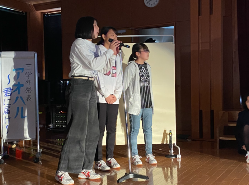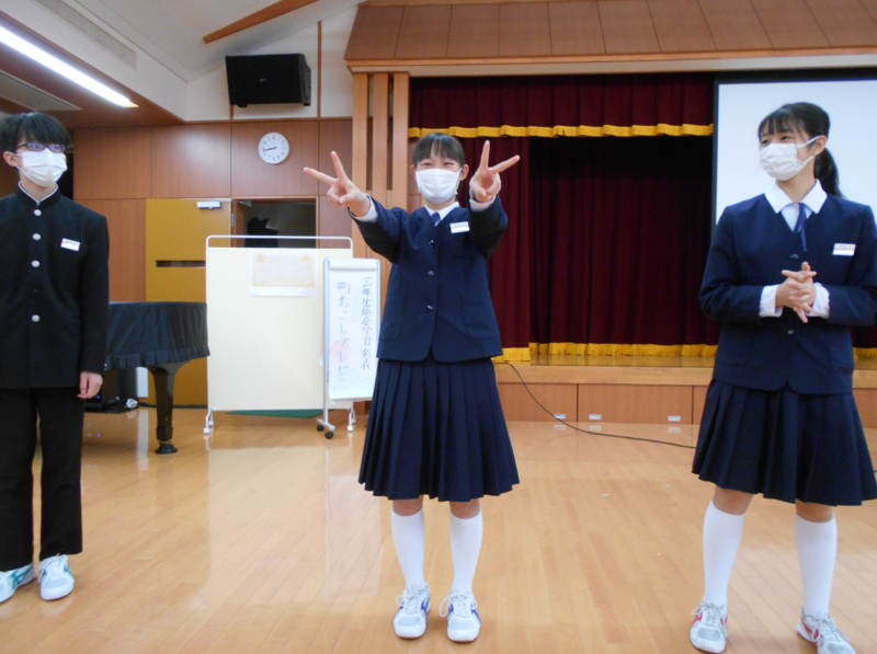 3年生の学年発表は劇「アオハル ~君に届け~」です。メイキングビデオから始まり,先生方のモノマネあり,ステキな歌ありと前半だけでも盛りだくさんです(^^)/ まずは前半部分の名シーンをご紹介します。