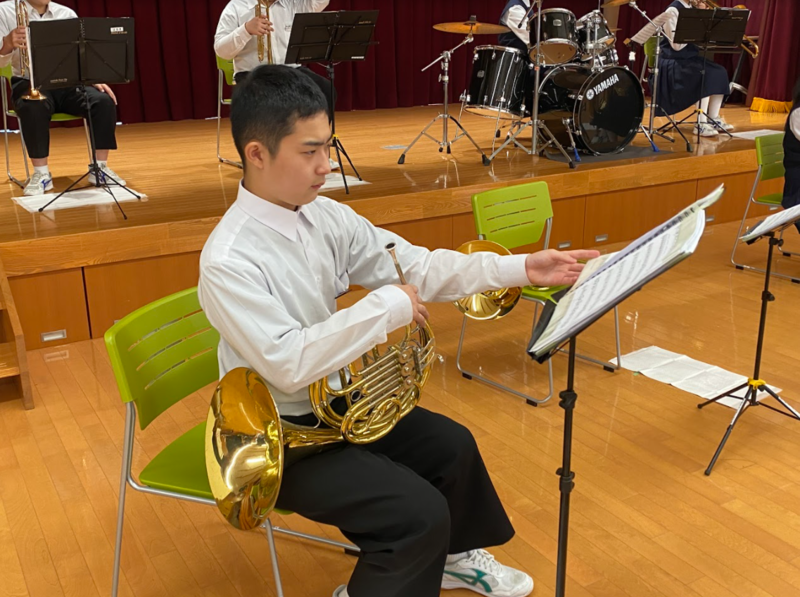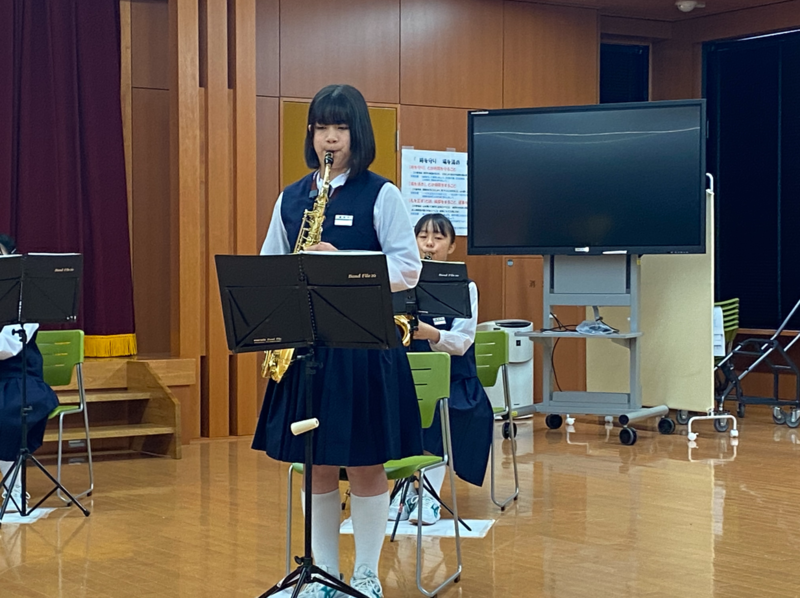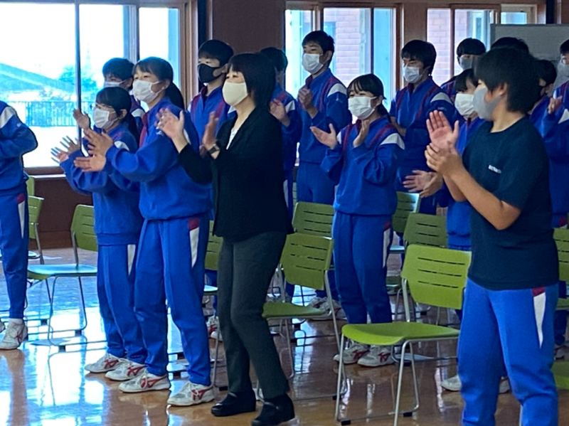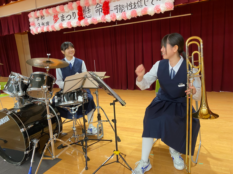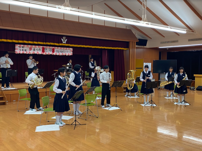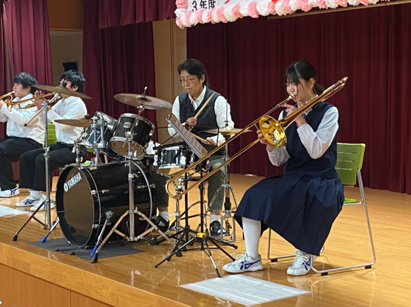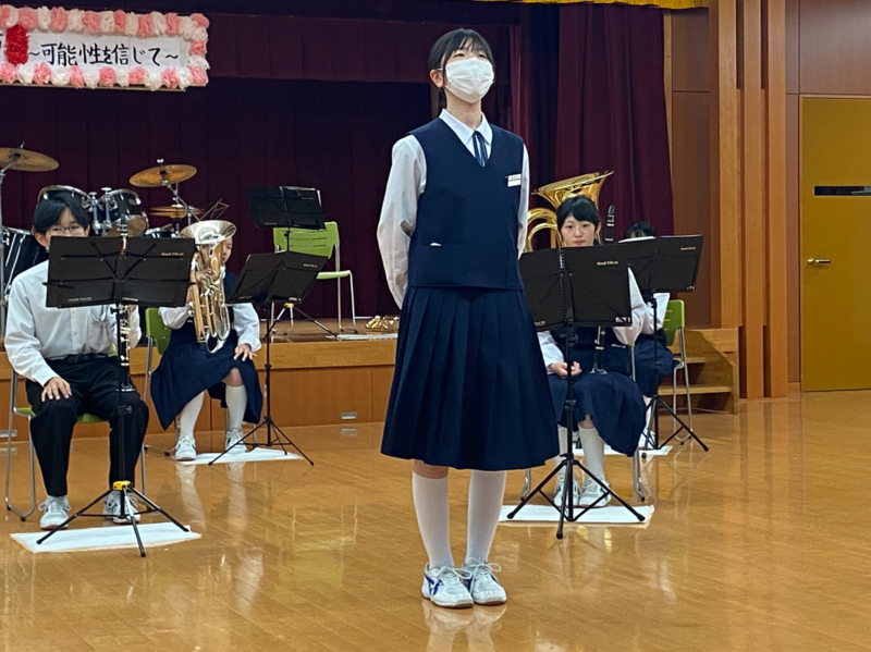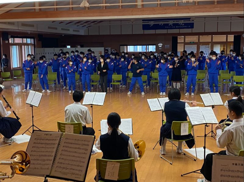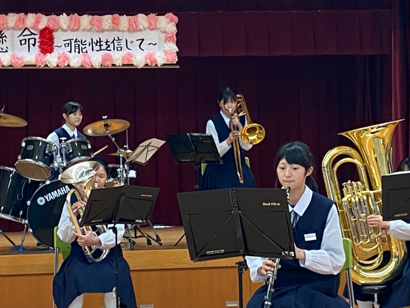 午後の部はアンサンブル部の演奏からスタートです 3年生が引退して1・2年生部員だけで初めて全校生の前での演奏でしたが,素晴らしい演奏でした 「学園天国」と「小さな恋の歌」を演奏し,演奏後には全校生と先生方からアンコールが起こりました 演奏中は立ち上がって手拍子をするなどみんなノリノリでしたね(^^)/ コロナ禍でなければ「学園天国」のときには「ヘーイヘイヘイ,ヘーイヘイッ!」と声を出したいぐらいでした