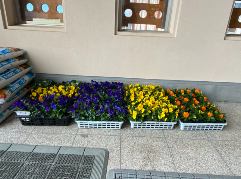 おはようございます 今日の5校時に行う植花作業で植える花のポットが玄関先に置いてあります。