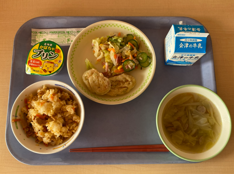 メニューは、キムチごはん、豆腐ナゲット、りっちゃんサラダ、コンソメスープ、牛乳、かぼちゃプリンです。とてもおいしくいただきました ごちそうさまでしたm(_ _)m