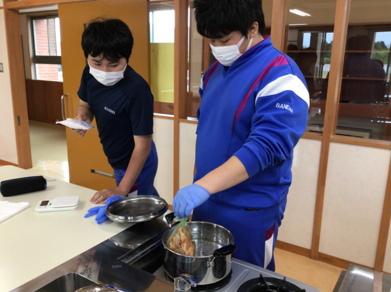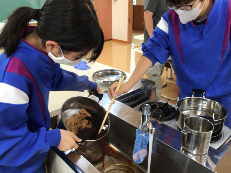 6校時目、家庭科室に行ってみると、3年生数名が調理実習をしています。家庭の授業じゃないし、全員いないしなぁ…何かな?と尋ねてみると、町おこしプレゼンの一環で参加するフリーマーケットで販売するかもしれないお菓子の試作に取り組んでいました。ドーナツ、ほうれん草クッキー、アップルパイを作るとのことで、タブレットで作り方を調べたり、分量を調べたり、みんなで協力しながら楽しそうに作っていました。おいしそうにできたようですが、お味の方はいかがでしたか?