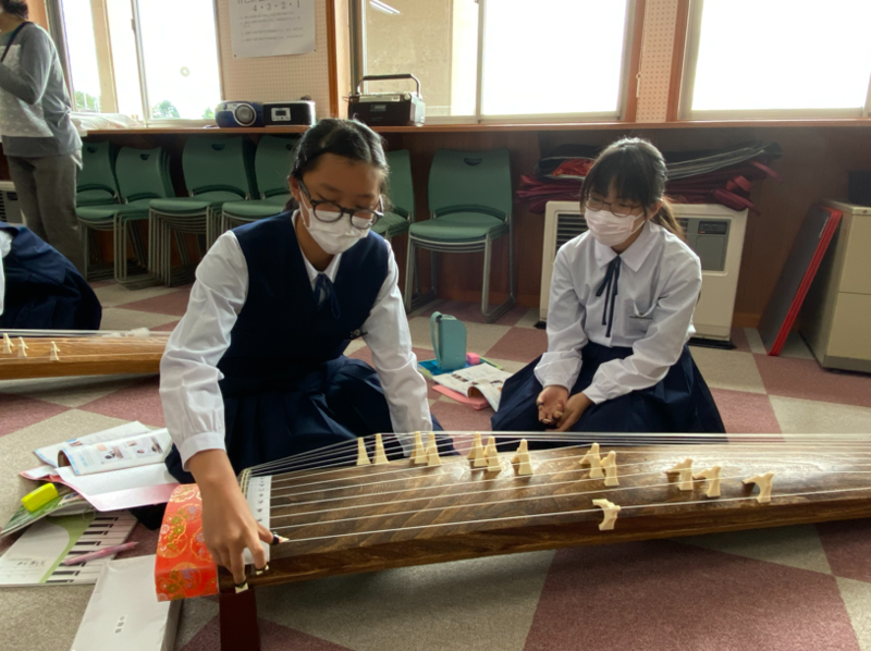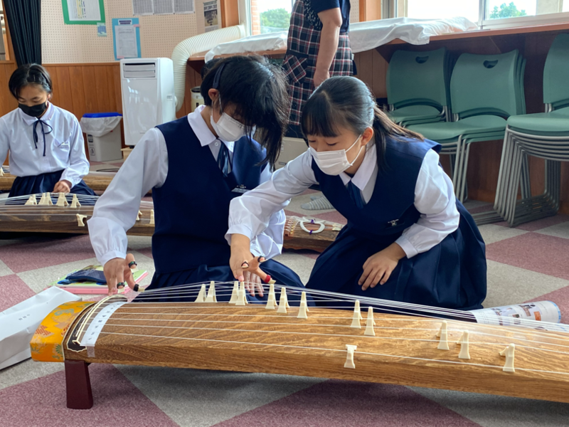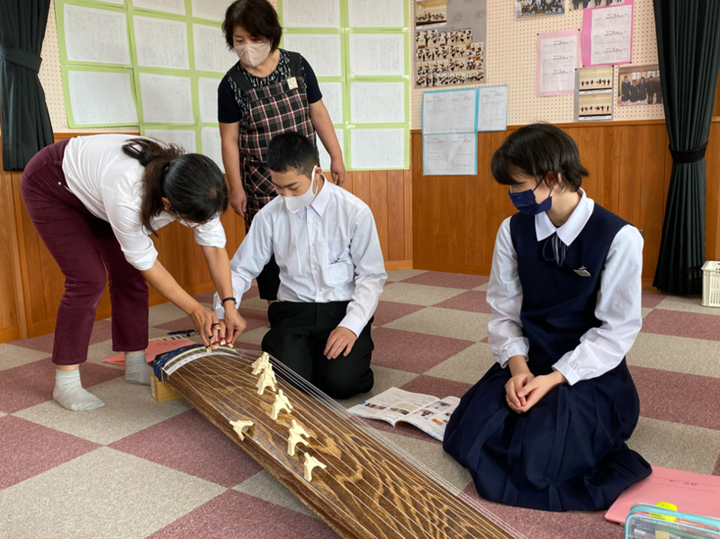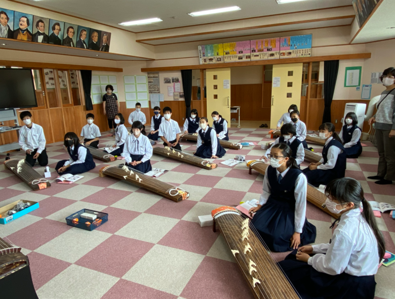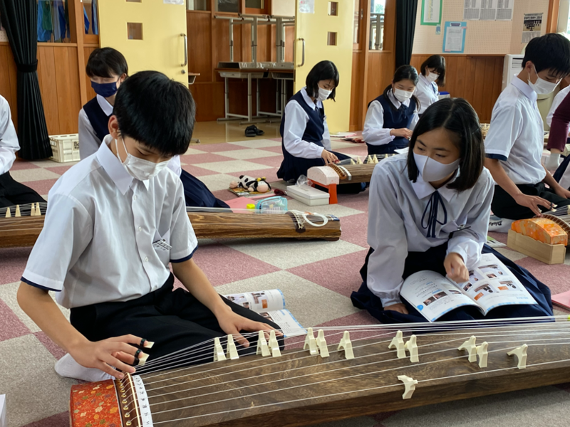 1年生は、音楽の授業でお琴の学習が始まりました。演奏するのはもちろん、実物のお琴を見るのも触るのも初めてという生徒も多かったですが、どうしてどうして、演奏する様は堂々としていましたよ。目標はみんなで「さくらさくら」を演奏することです。正座をしていたため足がしびれてしまった生徒もいましたが、初めてのお琴の演奏を楽しんでいた1年生です(^^)/