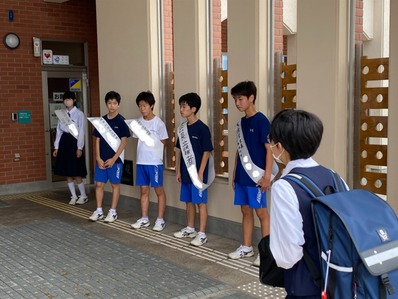 9/21に実施される生徒会役員背挙に向けて、昨日から選挙運動が始まりました。立候補した5人の生徒たちは、朝、玄関前に立って、登校してくる生徒たちに元気よくあいさつしていました。