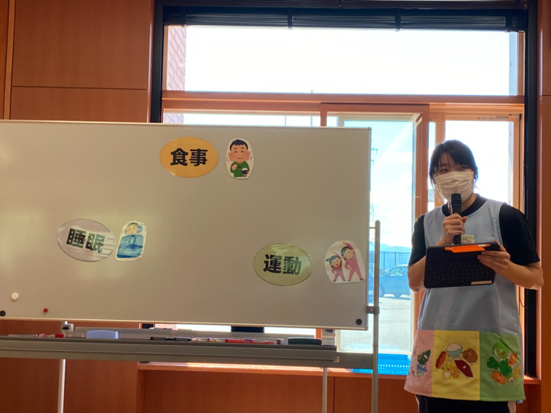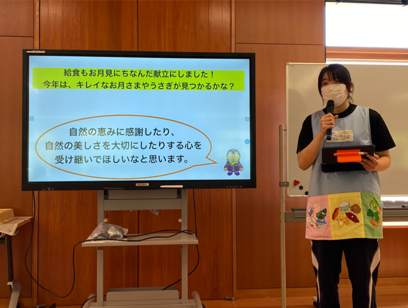 栁田先生からは、十五夜と食に関する内容をクイズも交えたり、食事、運動、睡眠の大切さについて、ご自身の学生時代の経験を含めたりしたお話をしていただきました。