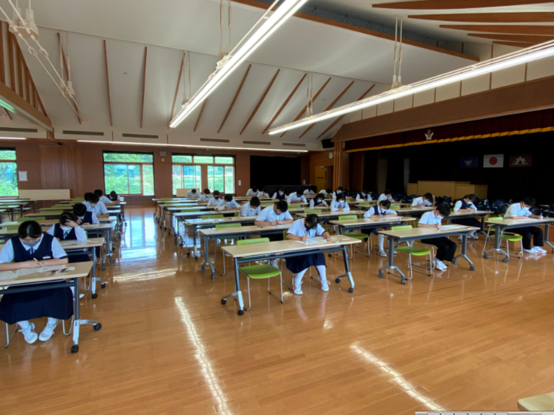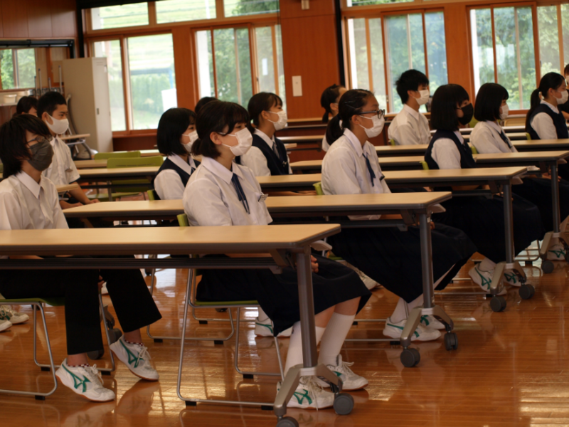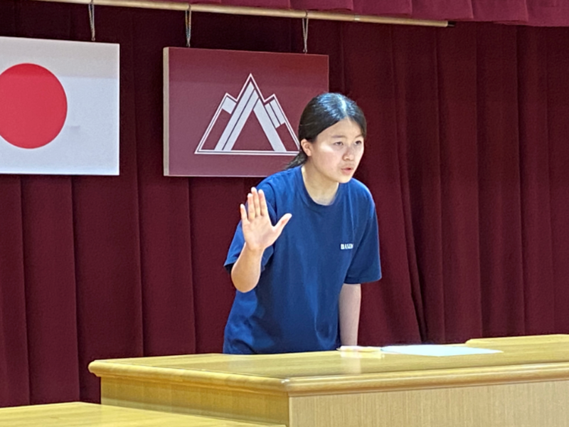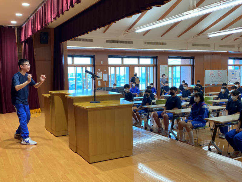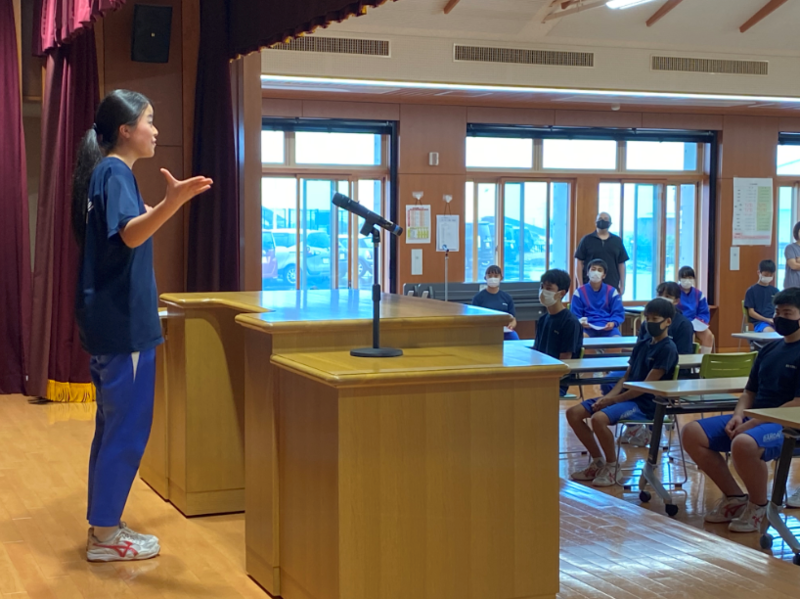 5校時目は全校集会でした。8/27に行われる北会津地区英語弁論大会に出場する2名の発表と、9/2に行われる全会津中体連駅伝大会に出場する選手を代表して3年生のI・Tくんが抱負を発表しました。本番当日は、自信をもって今までの練習の成果を発揮してきてほしいと思います。全校生で応援しています!