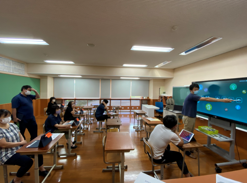 教育環境コーディネーターの高田さんから、電子黒板やタブレットの使用方法について教えていただき、教職員も実際に操作してみました。
