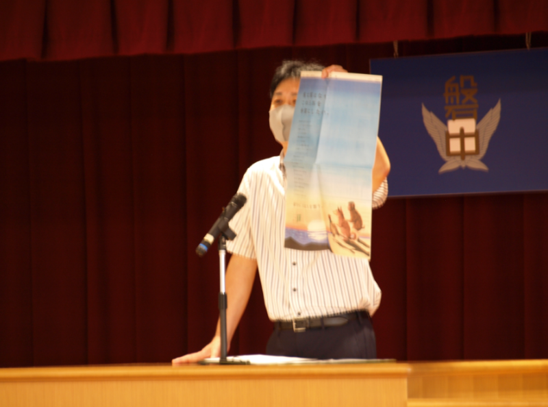 校長式辞では、1学期終業式に校長先生から出された宿題の答えが発表されました。ちなみに、宿題は「桃太郎は、なぜ、犬、猿、キジの3匹を仲間にしたのか。その理由を考える」というものでした。ある新聞広告に載っていた答えの一つが紹介されました。(答えはお子様に聞いてみてくださいね(^_^) )