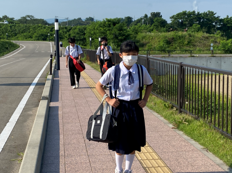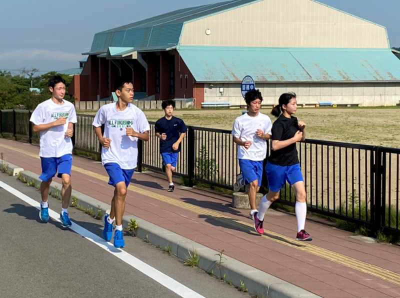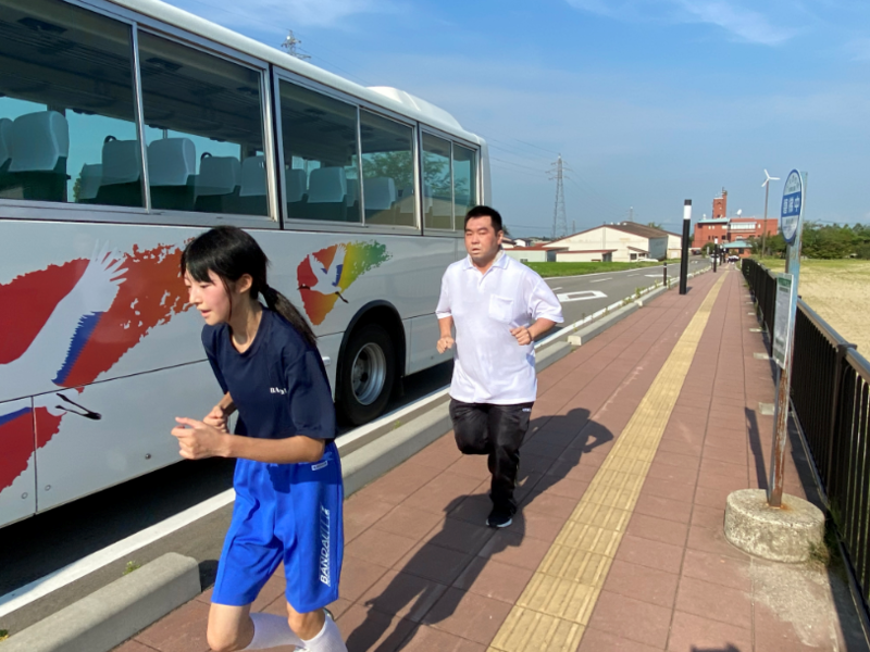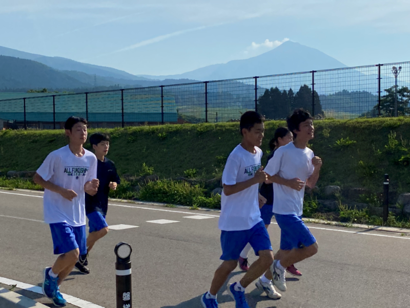特設陸上部のみなさんは、1学期最終日の今日も朝練に取り組んでいました。雄大な磐梯山に見守られながら一生懸命走っています。生徒たちの安全管理、監督のため、T先生も一緒に走っています。夏休み中も、朝練に取り組む予定です。