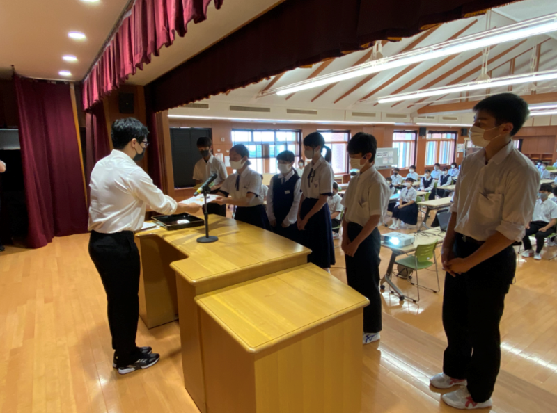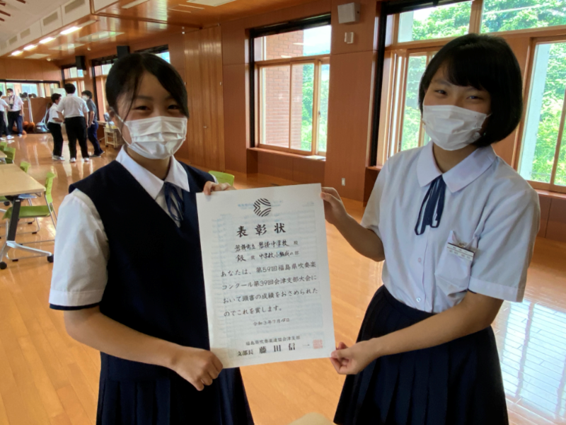吹奏楽コンクールで銀賞を受賞したアンサンブル部の皆さんに、賞状を伝達しました。今までの練習における部員一人一人の頑張りと、全員の心を一つに合わせて本番でステキなハーモニーを奏でた証の賞状ですあらためて、アンサンブル部のみなさん、おめでとうございました(^^)/