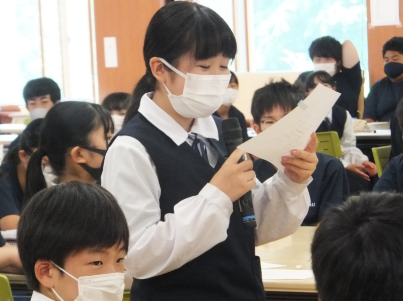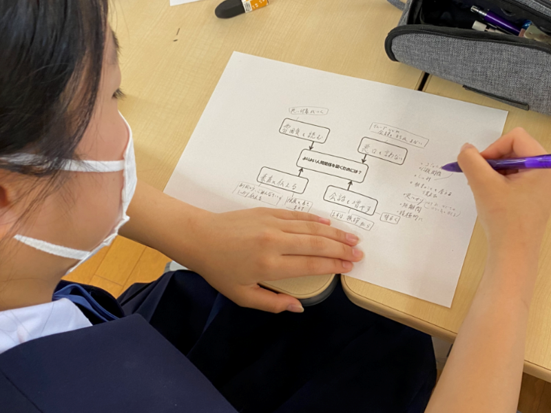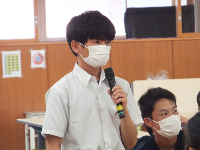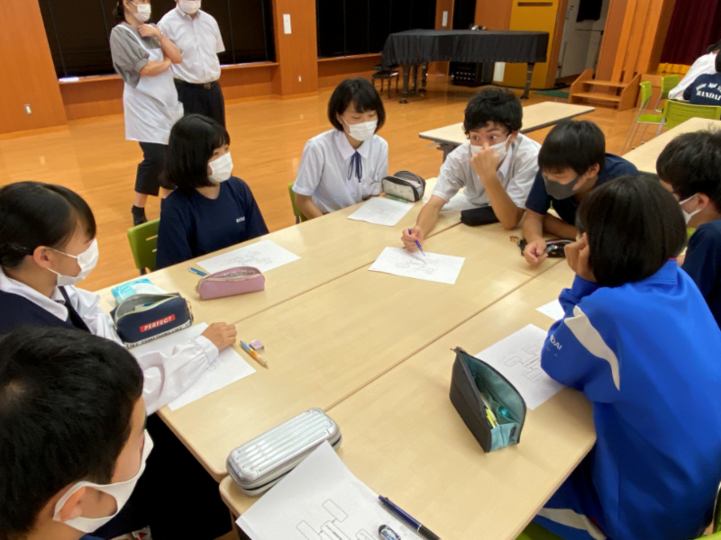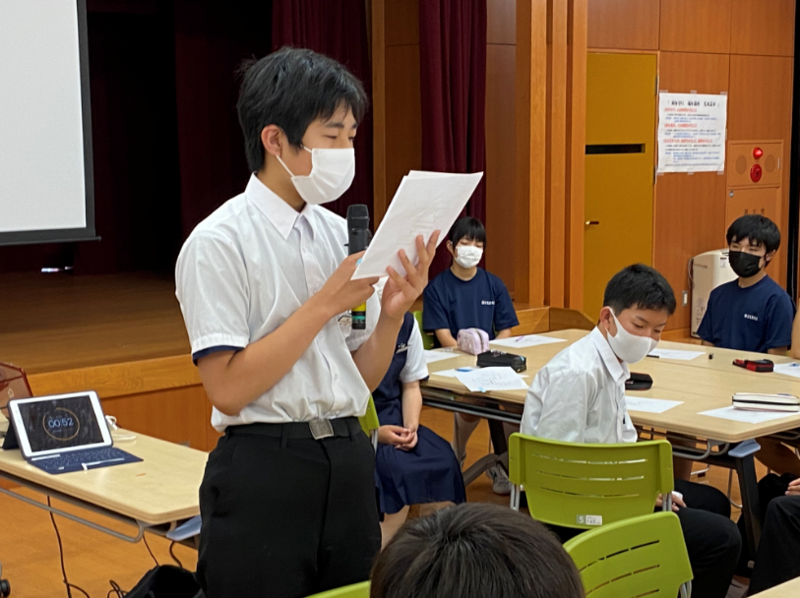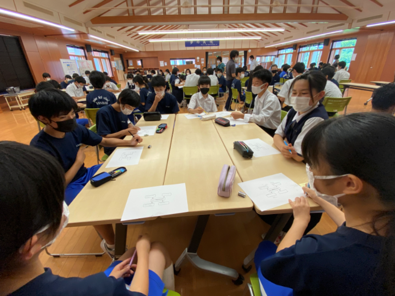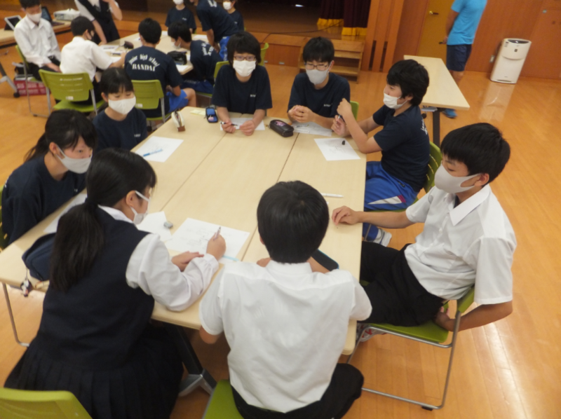 本日の3校時目に全校道徳を行って、よりよい人間関係を築くにはどうすればよいかをみんなで考えました。全校生が10班に分かれて、自分で考えた意見を班内で発表し、班ごとに協議して、よい人間関係を築くのに大切なことをまとめました。最後に、各班の代表生徒が発表してくれました。各班からは、相手を思いやったコミュニケーションや相手の価値観を認めること、相手の気持ちを考えた言葉選び、言葉遣いなどの礼儀を大切にする必要があるといった考えが発表されました。一人一人が真剣に考えて、積極的に話し合いに参加していました。今日の話し合いをもとに、2学期は、よりよい人間関係を築いて、さらにいい雰囲気の学級、学校にしていきたいですね。