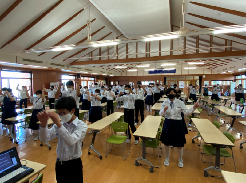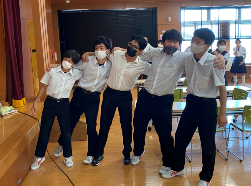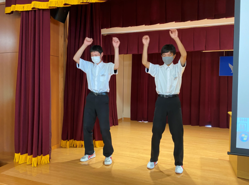 ALTのイアン先生が離任するにあたり、昨日の終業式後に「イアン先生お別れ会」を実施しました。生徒会長K・Hさんのあいさつ、各学年からの寄せ書きや記念品の贈呈の後、最後は全校生で踊りながら歌のプレゼントをしました。ステージ上でダンスのお手本を披露してくれたのは生徒会役員のT・RくんとM・Mくんの二人。イアン先生も3年生男子と肩を組んで一緒に歌いました。