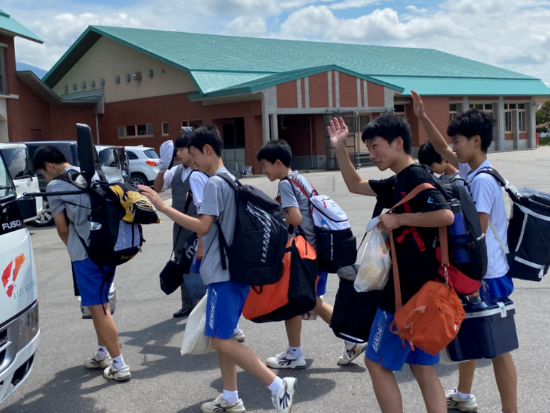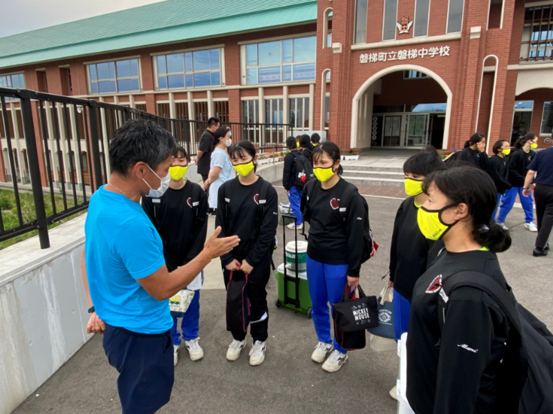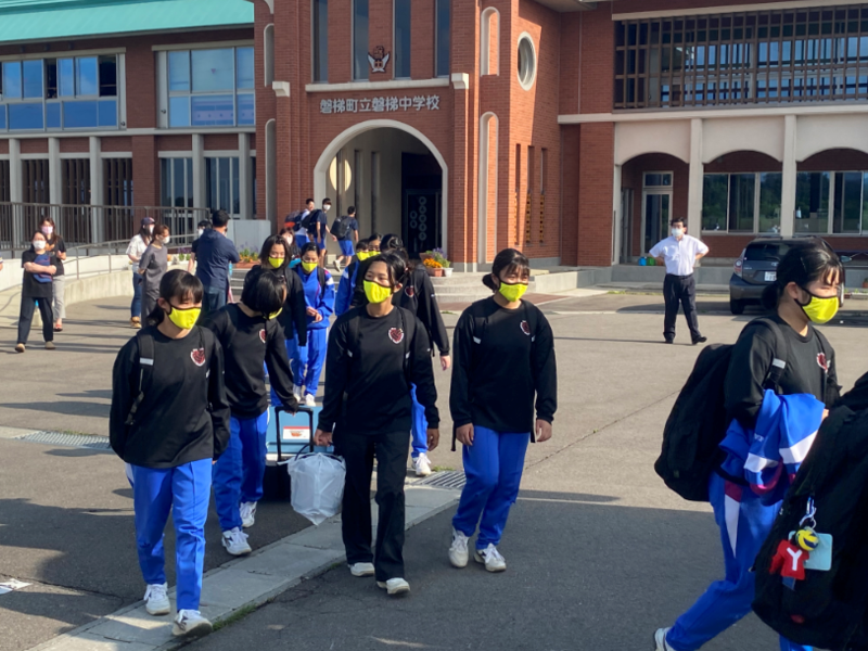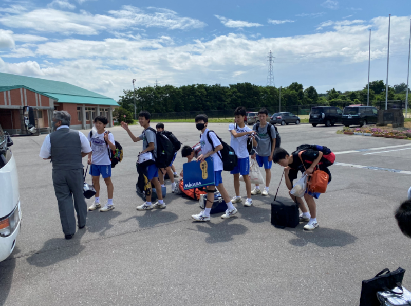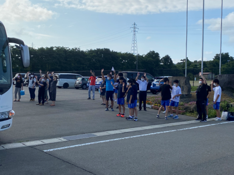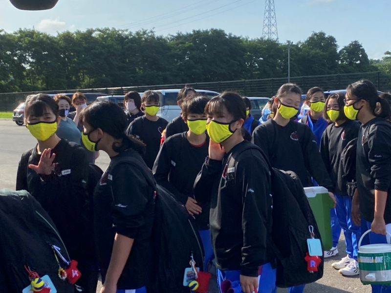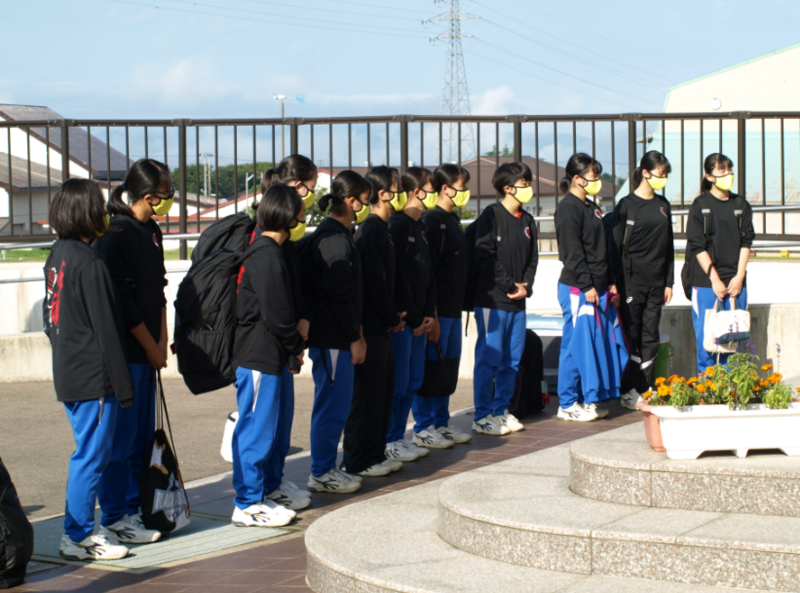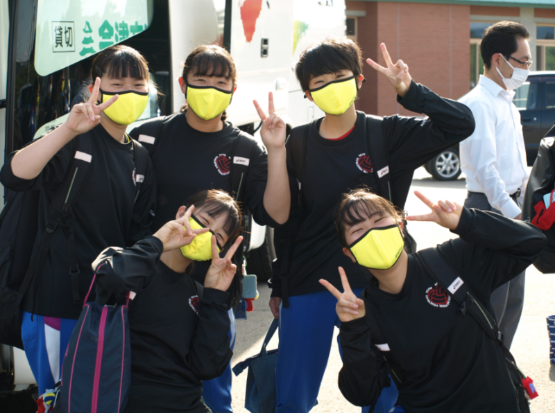 本日から中体連県大会が始まります。おそろいの黄色いマスクを着けたバレー部が、生徒や保護者の皆様、教職員に見送られて、試合会場の福島市あづま総合体育館に向けて元気に出発しました。