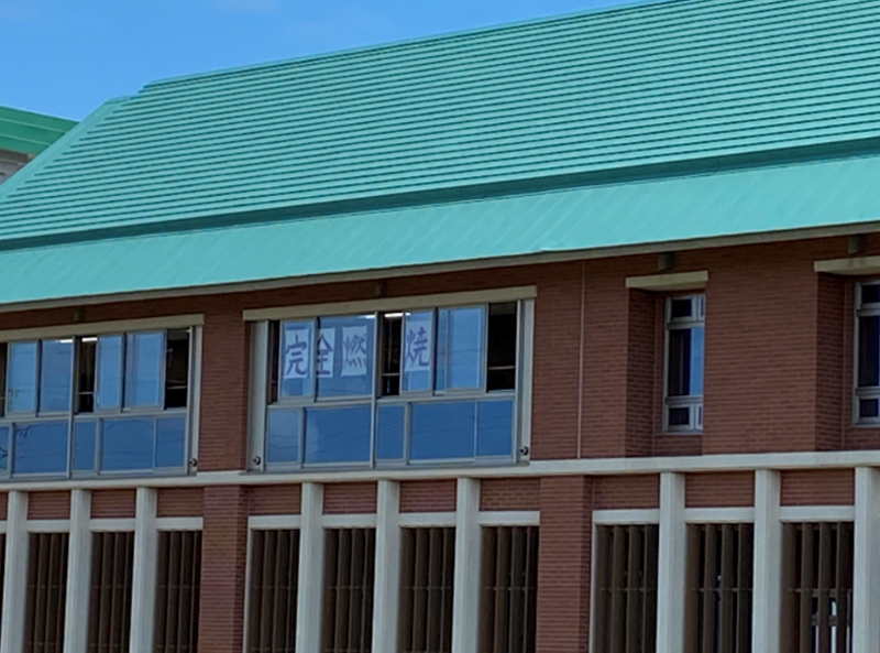 特別支援学級教室の窓に、大きく「完」「全」「燃」「焼」と書かれた4枚の紙が貼られています。中体連県大会と吹奏楽コンクール会津支部大会に出場する選手やアンサンブル部のみんなにエールを送ろうと、特別支援学級の生徒が心を込めて書いてくれました。昨日、試合があったバレー部のみんなに元気と勇気を与えてくれ、バレー部は完全燃焼することができました。そして、今日はバスケットボール部のみんなに、明後日は特設水泳部の選手に、そして、日曜日にはアンサンブル部のみんなの心にエールが届き、きっと完全燃焼してくれることでしょう!