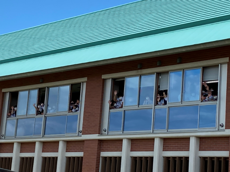 朝練に来ていた特設陸上部の生徒たちや保護者の皆様、教職員が手を振って見送りました (^^)/