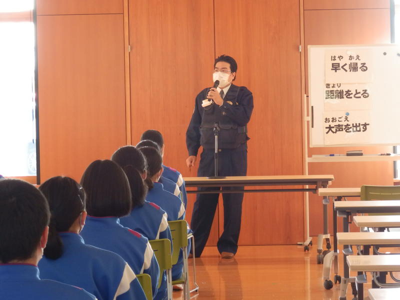 写真は訓練の後の全体会で、磐梯駐在所の方から講話をいただいているところです。今回は「身の回りの危険」ということで、登下校時の声かけ事案やインターネットやSNSの危険性やトラブルについてもお話しいただきました。生徒は真剣に取り組んでいました。