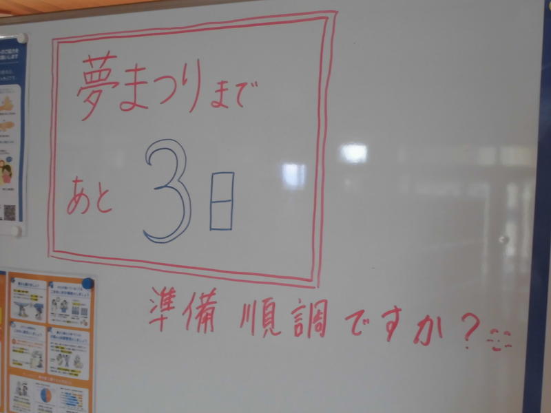 現在、「夢まつり」に向けて準備が進められています。総合発表や各学年で準備している発表のリハーサル、生徒会企画の準備、学年発表の小道具も協力して作っています。撮影した動画の編集は先生方が中心に行っています。会場看板は3年生が作成し、写真のようにほぼできあがりました。正面昇降口のホワイトボードには写真のように、残り3日の表示がされています。16日の「夢まつり」では、今までの頑張りを発表します。