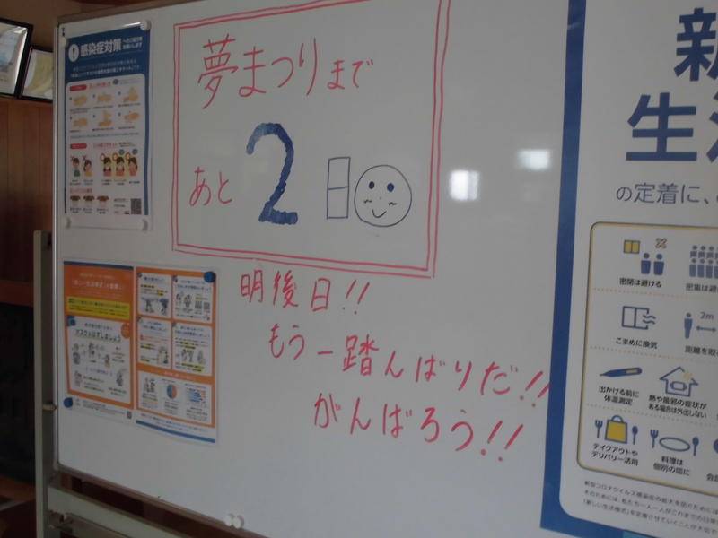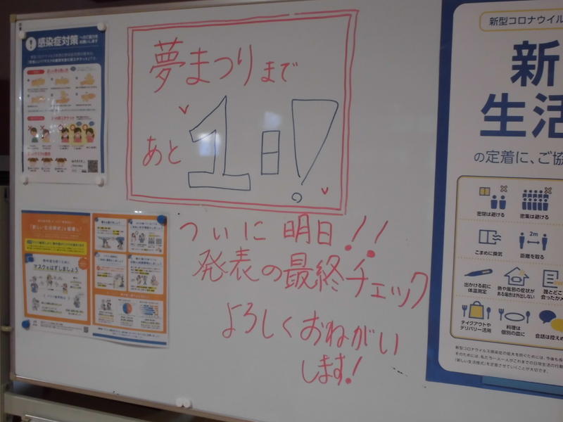 2020年10月15日 18時58分いよいよ明日は「夢まつり」です。今日は最終リハーサルで最後の確認を行いました。各学年ともできる限りの準備をしています。学校中で忙しく準備に取り組む生き生きとした生徒の姿がたくさん見られました。みんなが明日を楽しみにしています。ぜひ、ご家庭でも準備の様子を話題にしていただければと思います。今日の写真は恒例の玄関前のカウントダウンと、できあがった会場の様子です。