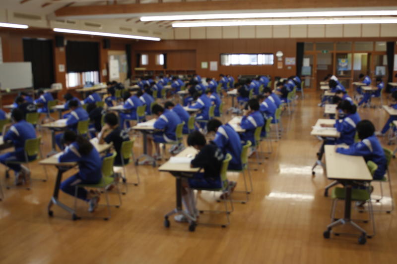 全校生徒が多目的ホールに集まり、全校生一斉に行うテストです。まるで高校入試の会場のようです。
