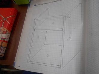 1年生の技術は木工製作の設計を行っています。写真をご覧ください。今までは「こんなものを作りたい」とイメージを膨らませてきました。これが写真の構想図です。いろいろな書き込みから試行錯誤の様子が伺えます。
