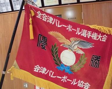 バレー部ですが、全会津春季バレーボール大会で優勝しました。決勝戦は大激戦だったそうです。厳しい試合を勝ち抜いての優勝です。優勝旗の写真をご覧ください。