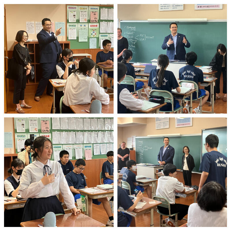 3年生の英語の授業を参観し、途中からはご挨拶や質問コーナー、書記官の方からのクイズなど、3年生と交流を行いました。