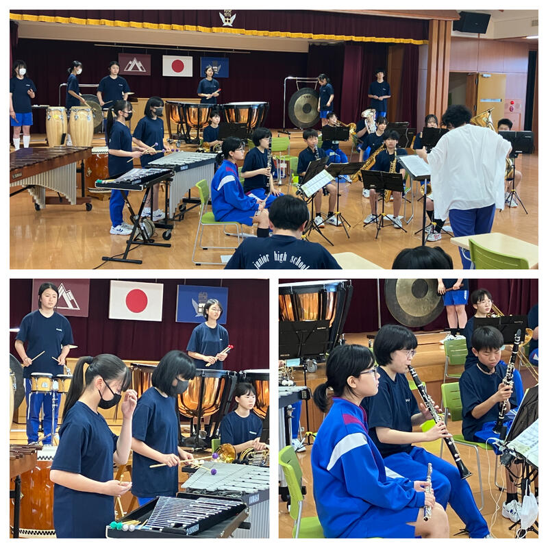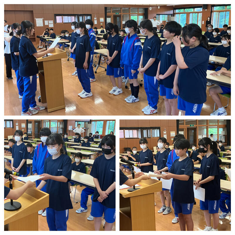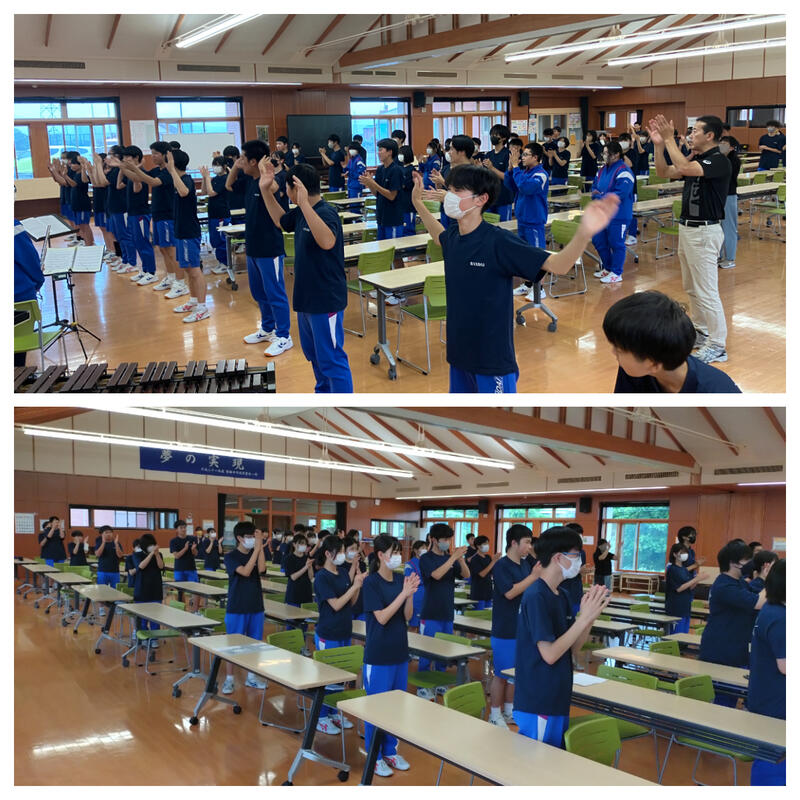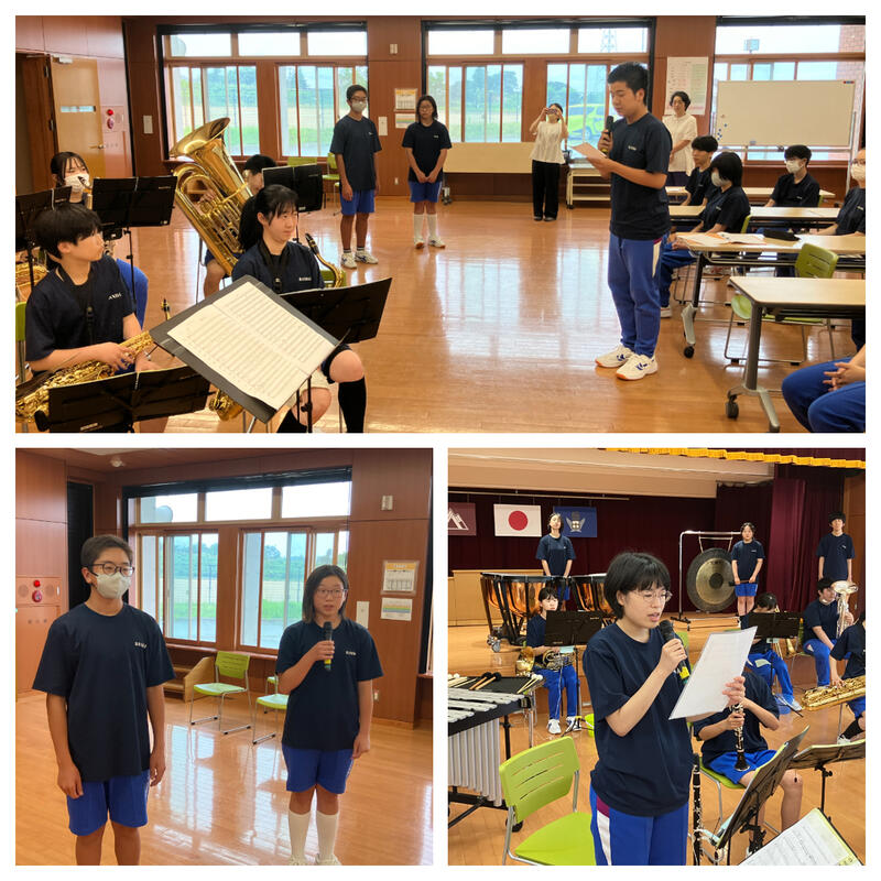 全校集会に続いて、7月6日に行われる吹奏楽コンクールに参加するアンサンブル部と、7月22日から始まる中体連県水泳大会に参加する2名の生徒の壮行会を行いました。