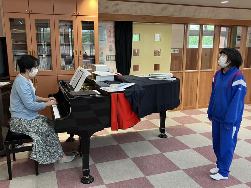 音楽室では、特設合唱部が練習していました。本日から女子パートの練習が始まり、今日はパート分けのために1人ずつ校歌を歌っていました。