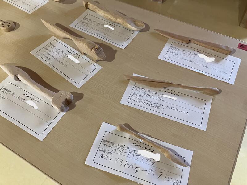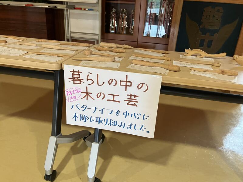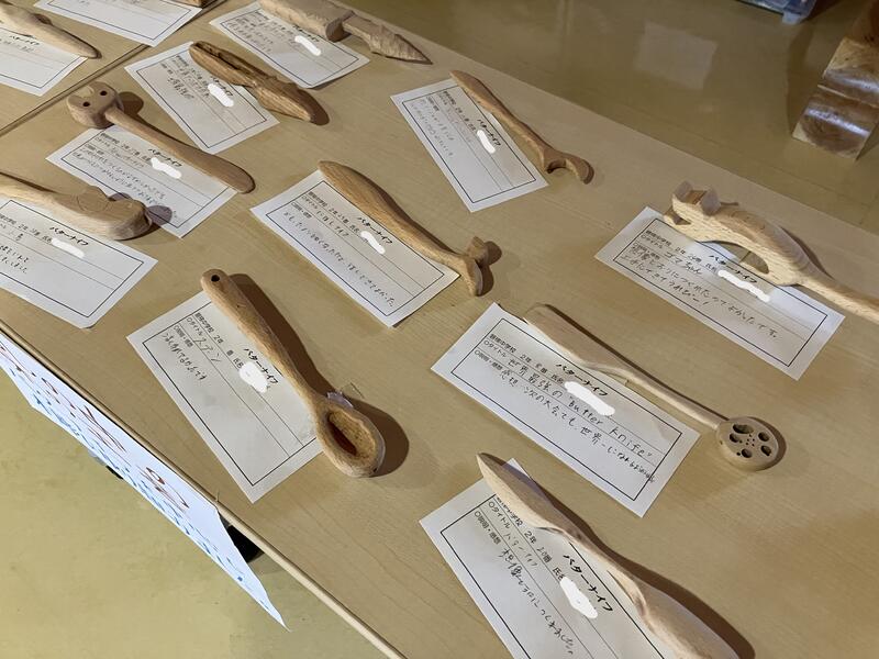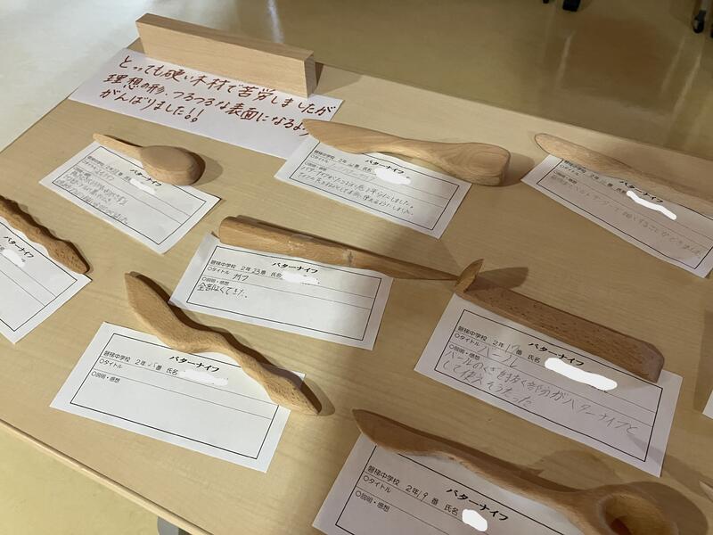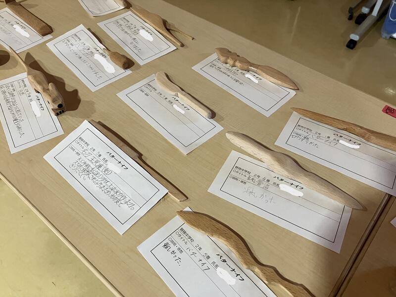昇降口には、2年生が1年生美術の授業の際に作成した「バターナイフ」が展示されています。
