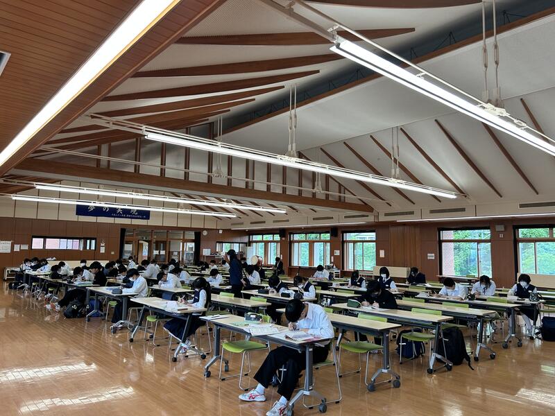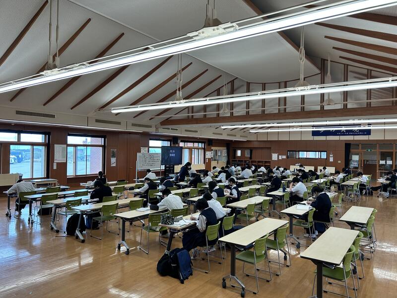 中体連に参加しない生徒が残っていた学校では、多目的ホールに全員で集まり自主学習を進めていました。