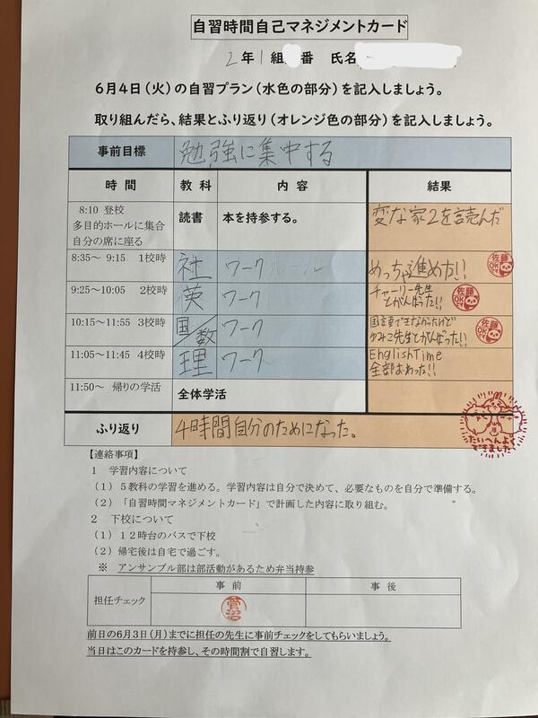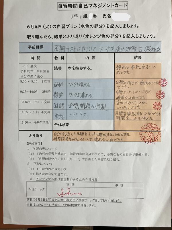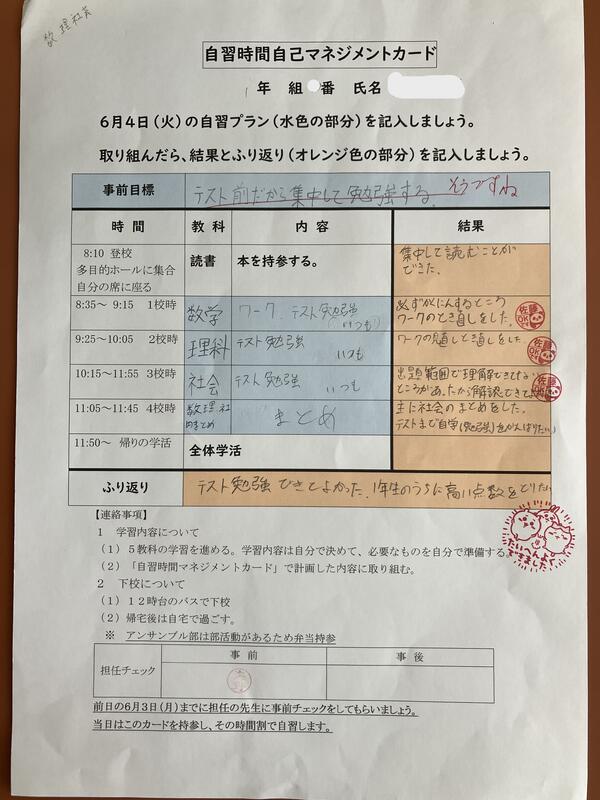 今年度は、自己マネジメント力向上のために、この時間にどのような学習をするかを事前に自分で計画し、毎時間ごとに振り返りを行いました。
