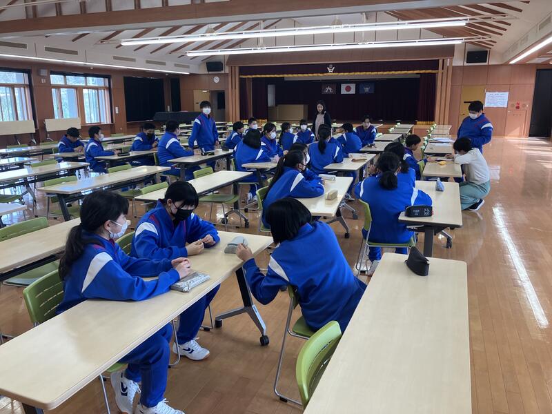 あいにくの天気のため、避難場所は多目的ホールとなりましたが、全員が話をしないで避難することができました。